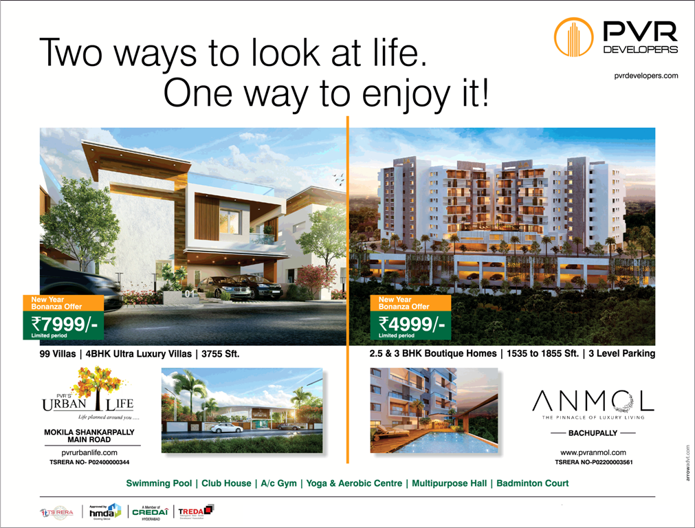 PVR Urban Life is a Luxury Residential Gated Community spread over 10.5 Acres, Surrounded by abundant greenery in the region. This project consists of 99 Premium Villas with various options to choose from, with plot sizes varying from 228 Sq Yards - 458 Sq Yards and built up areas of each villa ranging from a Modest 2800 Sq Ft - a Grand 4700 Sq Ft. Every Villa is equipped with 2 Car Parks. Urban Life is equipped with a Modern Club House with State of the art amenities and new age ergonomics designed to seamlessly align to the modern needs of today.