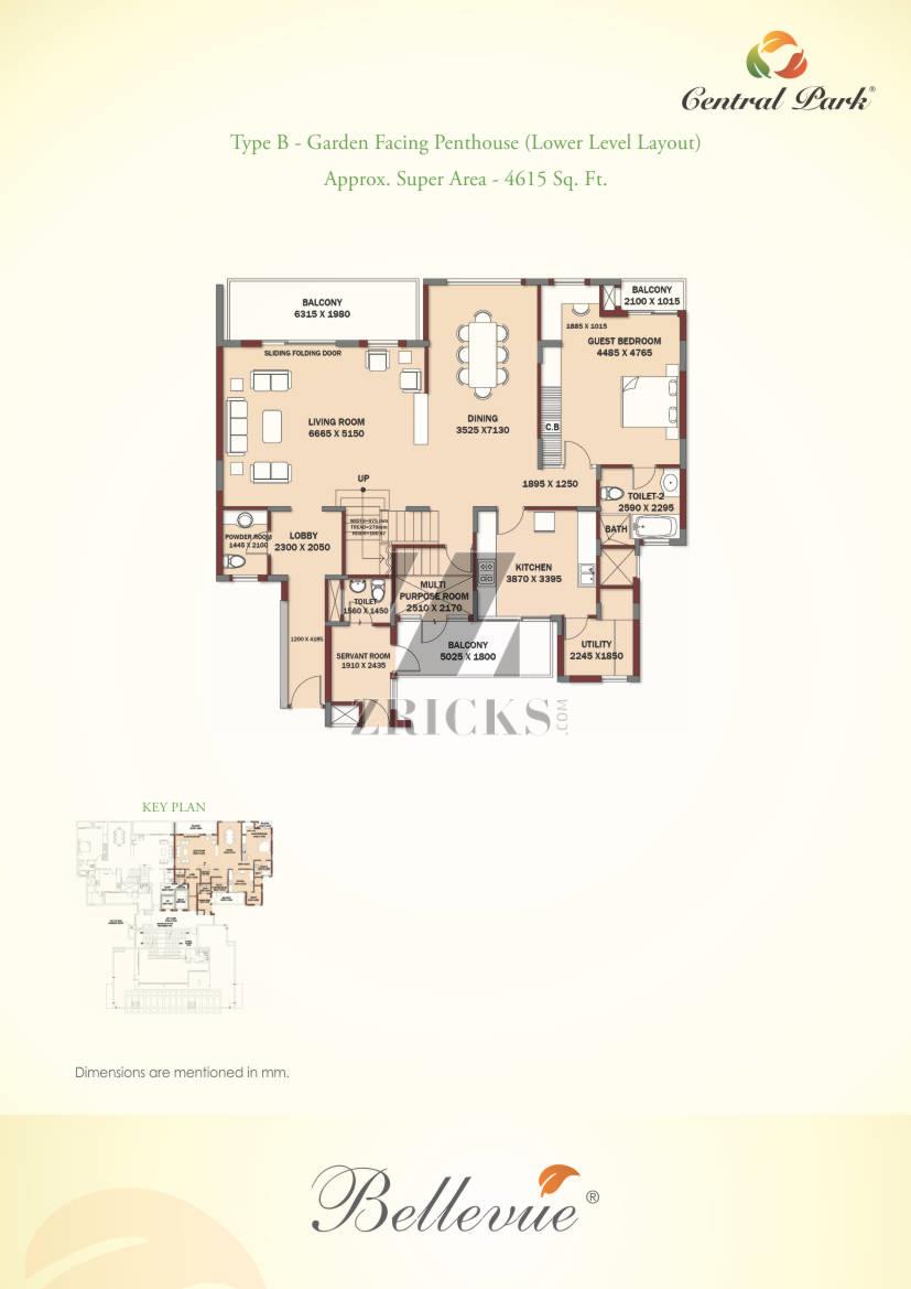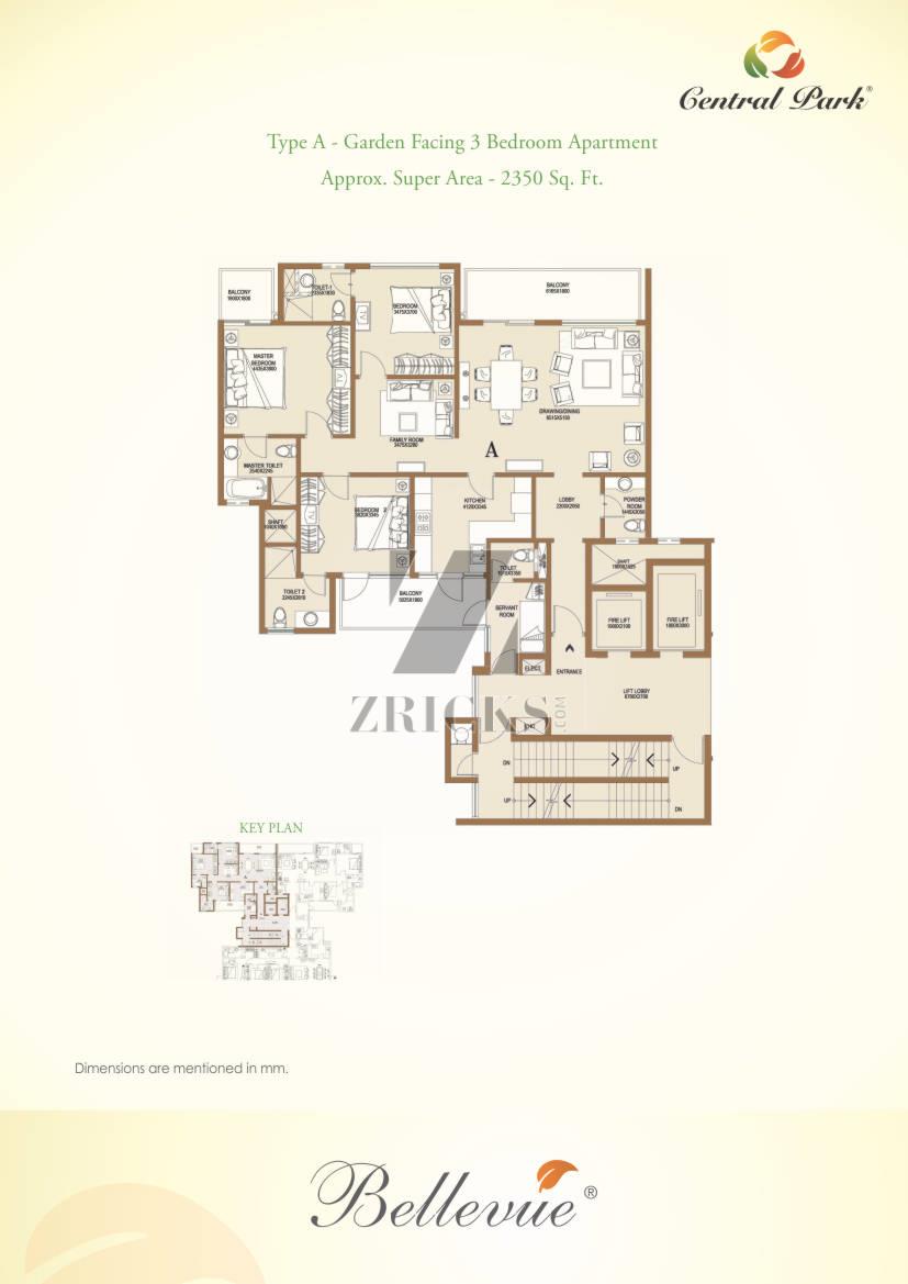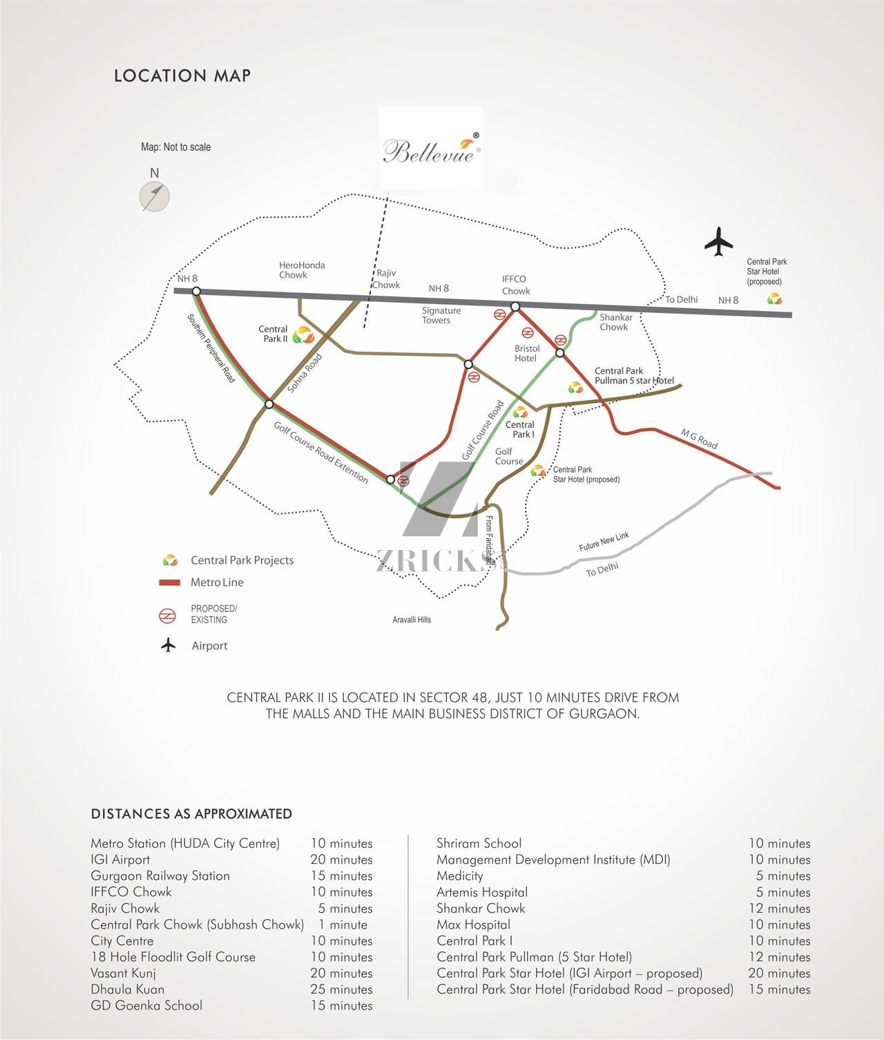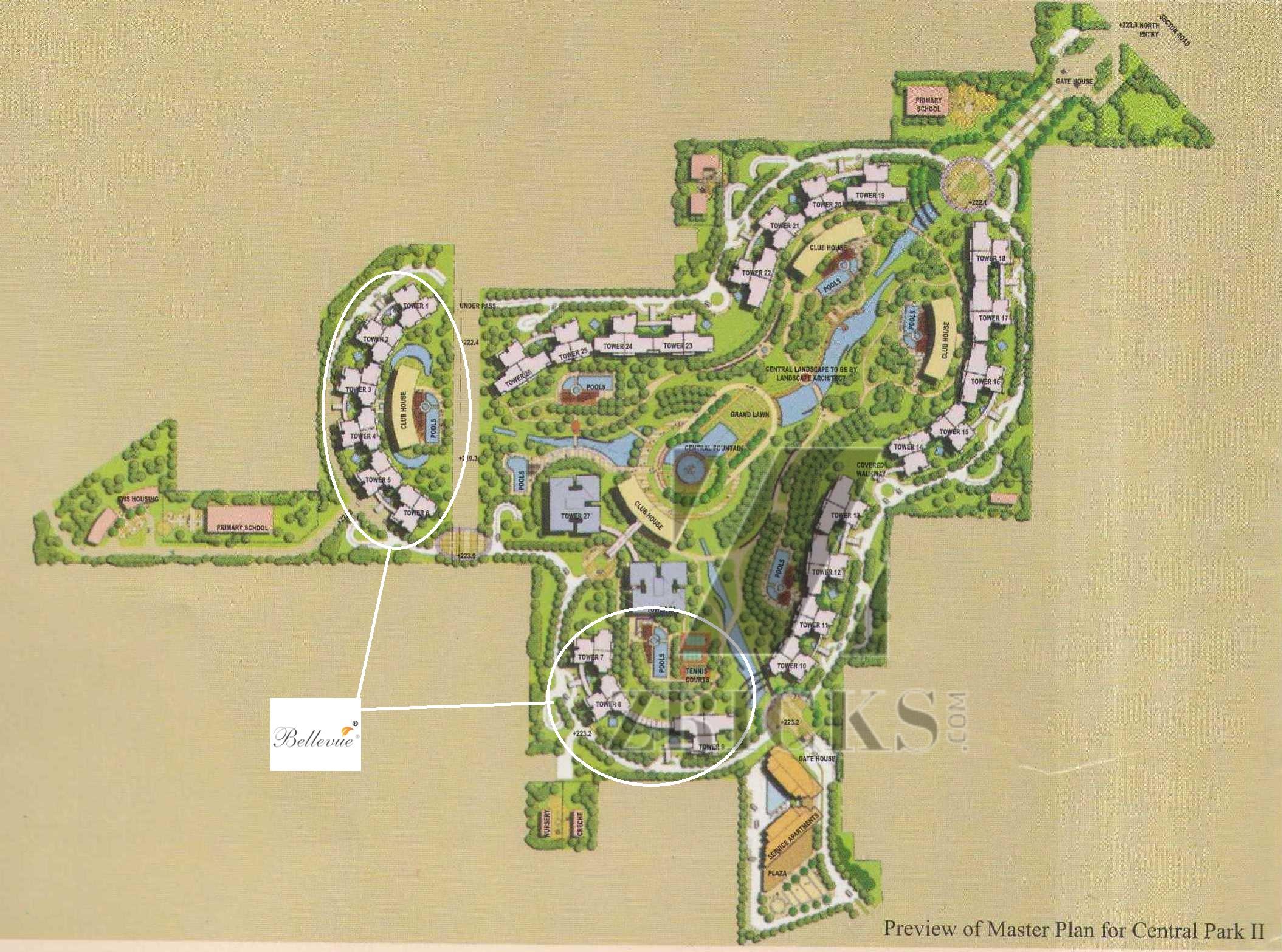 Central Park-II Bellevue is a premium residential project located at Sector 48 in Gurgaon along the Gurgaon-Sohna Road. This project offers a number of different styles in terms of housing solutions; ranging from 3 BHK apartments to six, highly-exclusive 4 BHK penthouses and eighteen townhouses or villas. All apartments are part of nine mid-rise residential towers and have a built-up area ranging between 2250 sq. ft. to 2350 sq. ft. The penthouses and villas range in size from 2650 sq. ft. to 4615 sq. ft. Along with excellent choices in housing, Central Park-II Bellevue also offers great amenities that have been integrated within the complex for the convenience of the residents.