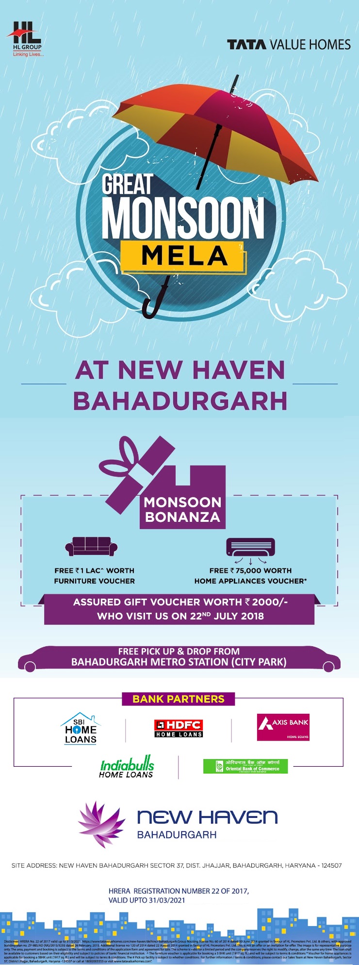 Tata Value Homes presents Great Monsoon Mela on 22nd July 2018 at Tata New Haven, Sector 37, Bahadurgarh.  Monsoon Offers: Assured gift voucher worth Rs 2000 Free pick up and drop facility