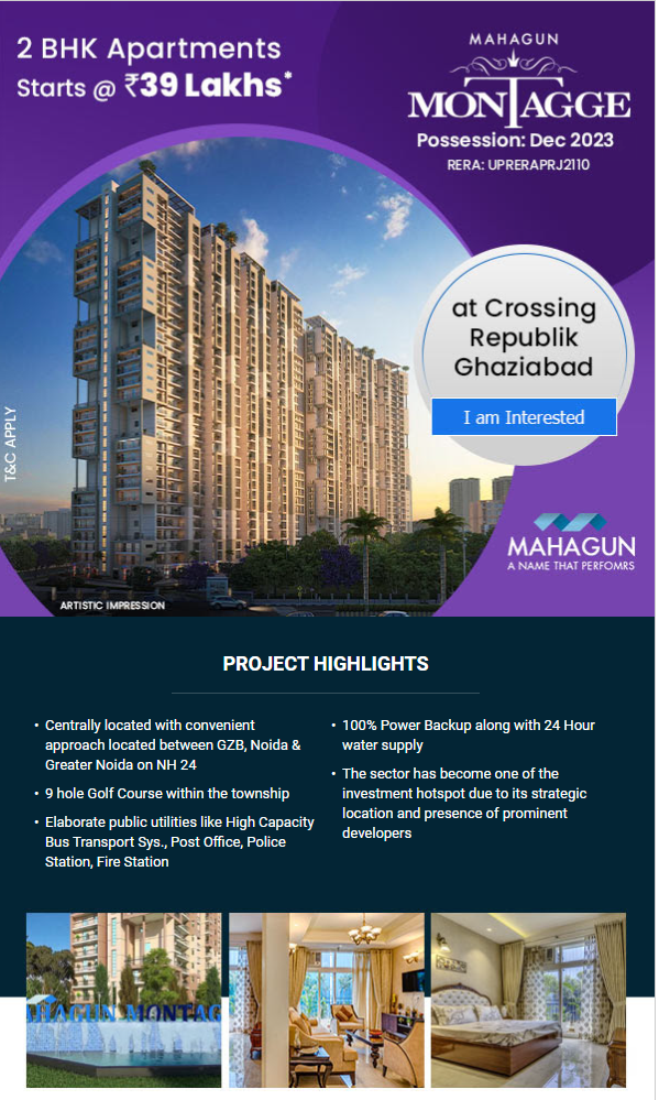 Mahagun Montage is a residential project located at Crossings Republik in Ghaziabad. Luxury is a state of affluence and grace. Mahagun Montage is designed with the vision to deliver luxury in its purest, yet si