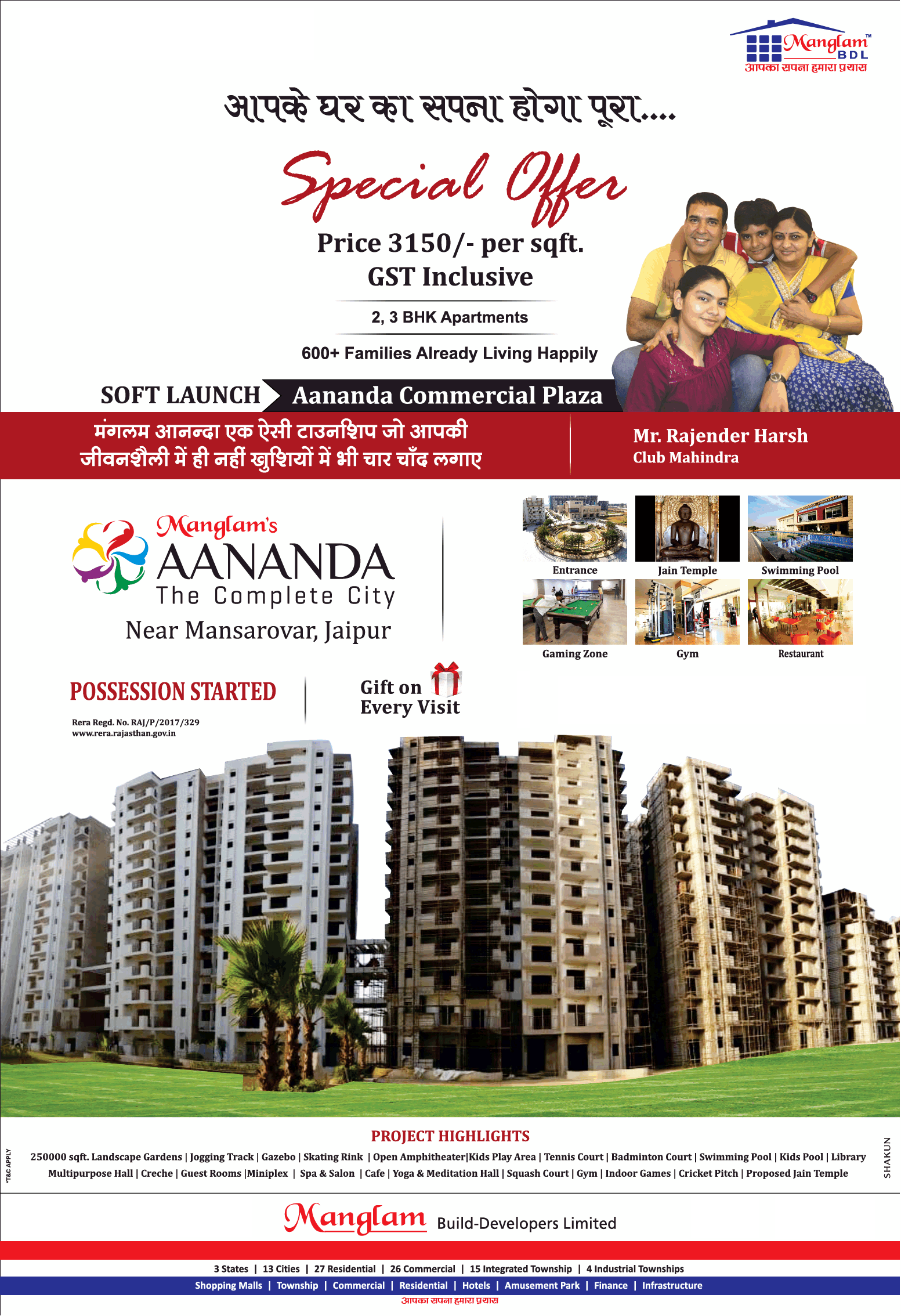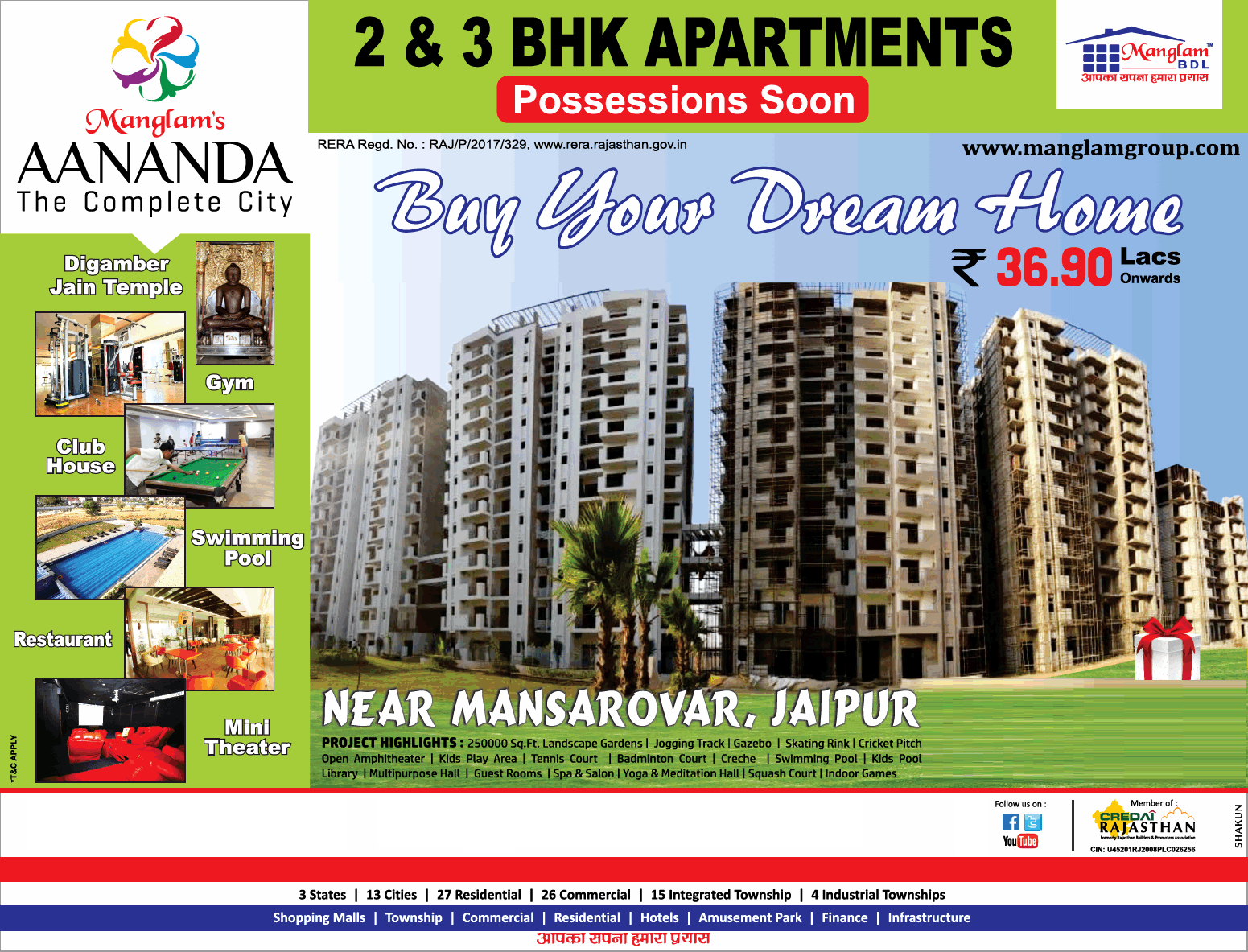 Manglam Aananda is an ultimate reflection of the urban chic lifestyle located in Sanganer, Jaipur. The project hosts in its lap exclusively designed Residential Apartments, each being an epitome of elega