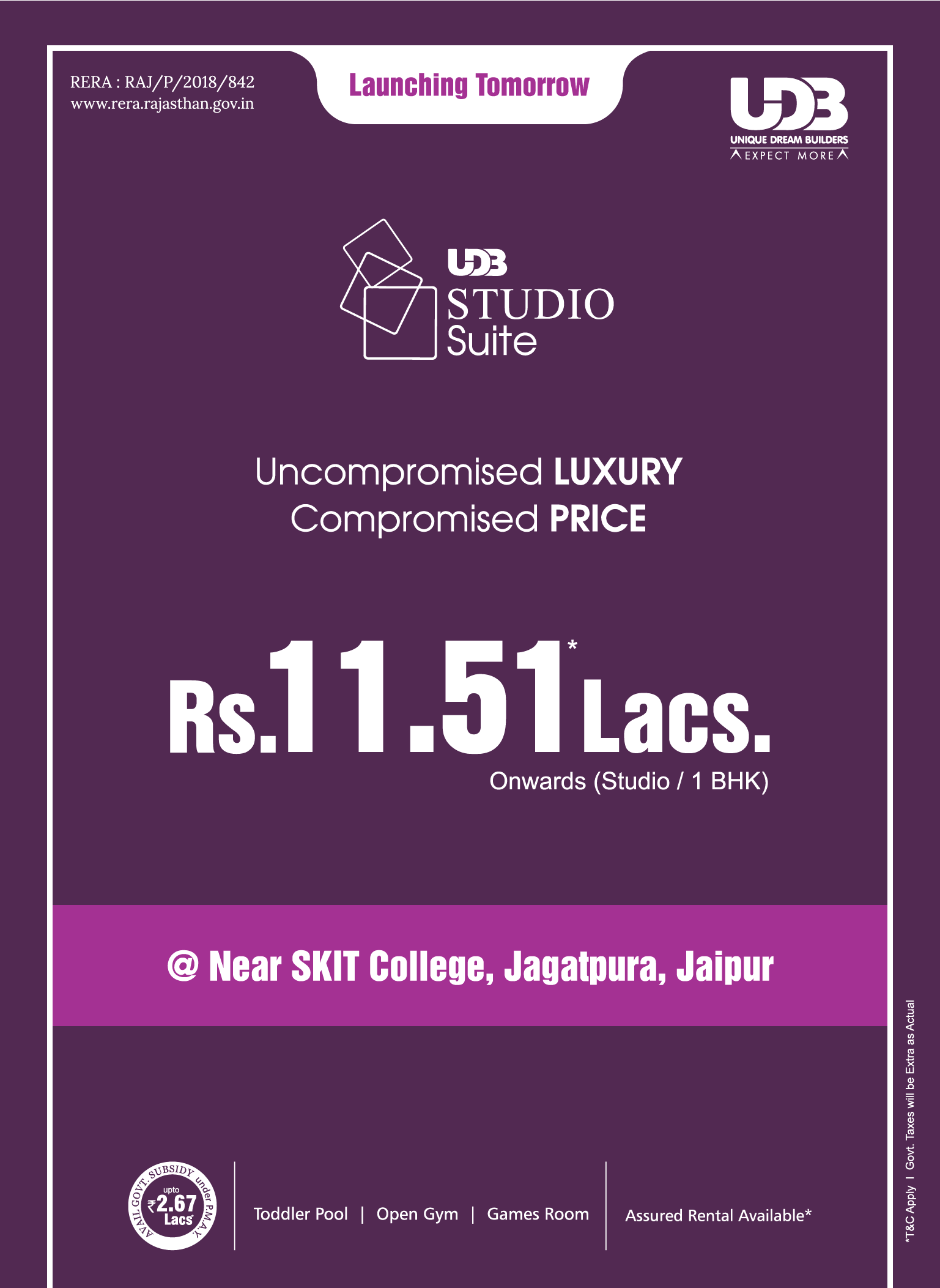UDB Studio Suite is an ultimate reflection of the urban chic lifestyle located in Jagatpura, Jaipur. The project hosts in its lap exclusively designed Residential Apartments, each being an epitome of elegance and simplicity.