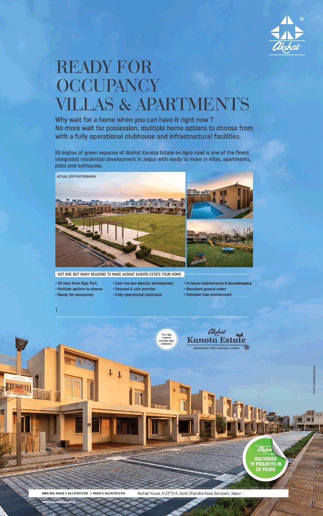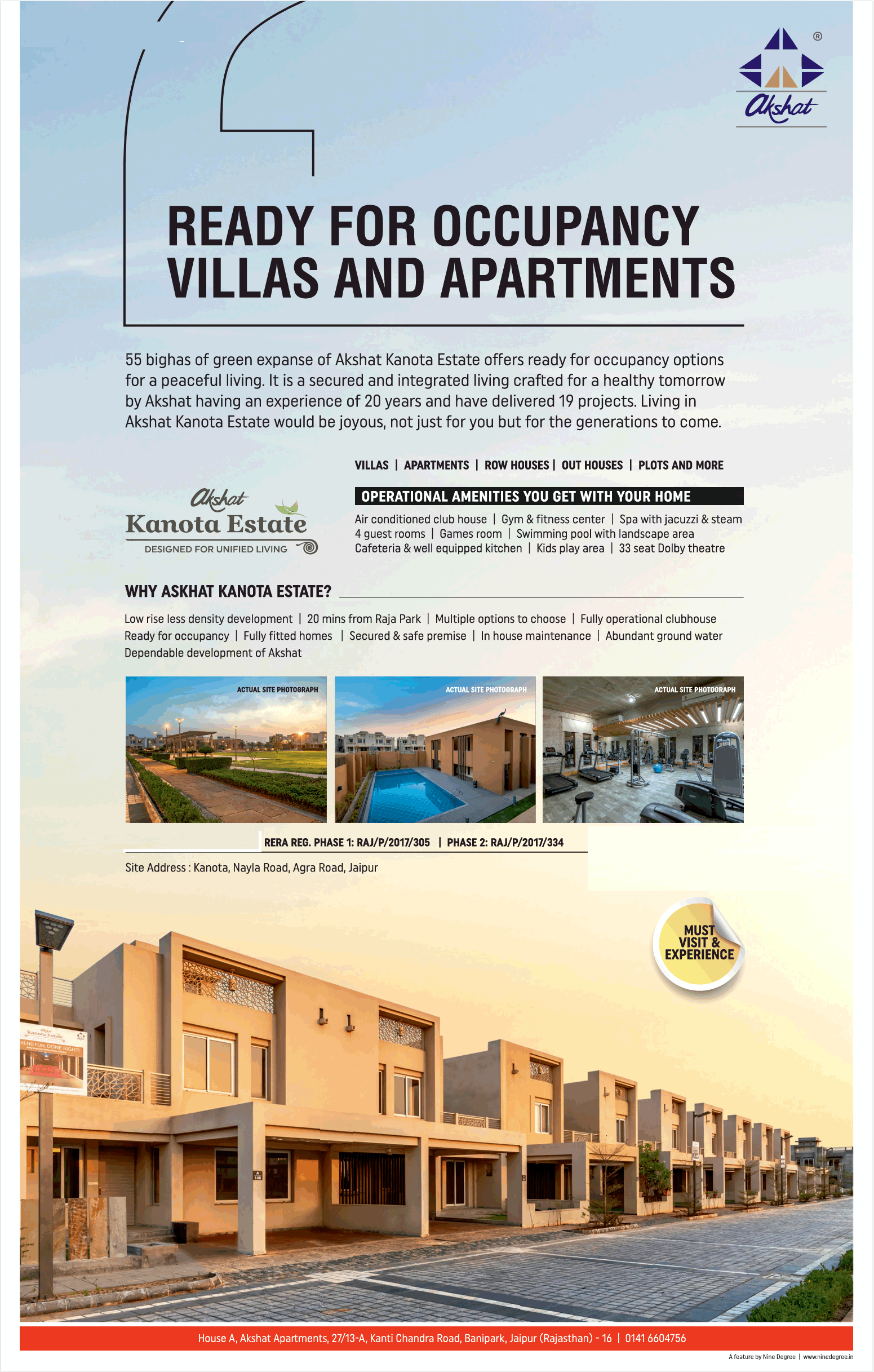 55 bigha of the green expanse of Akshat Kanota Estate offers ready for occupancy options for a peaceful living. It is a secured and integrated living crafted for a healthy tomorrow by Akshat having an experience of 20 years and have