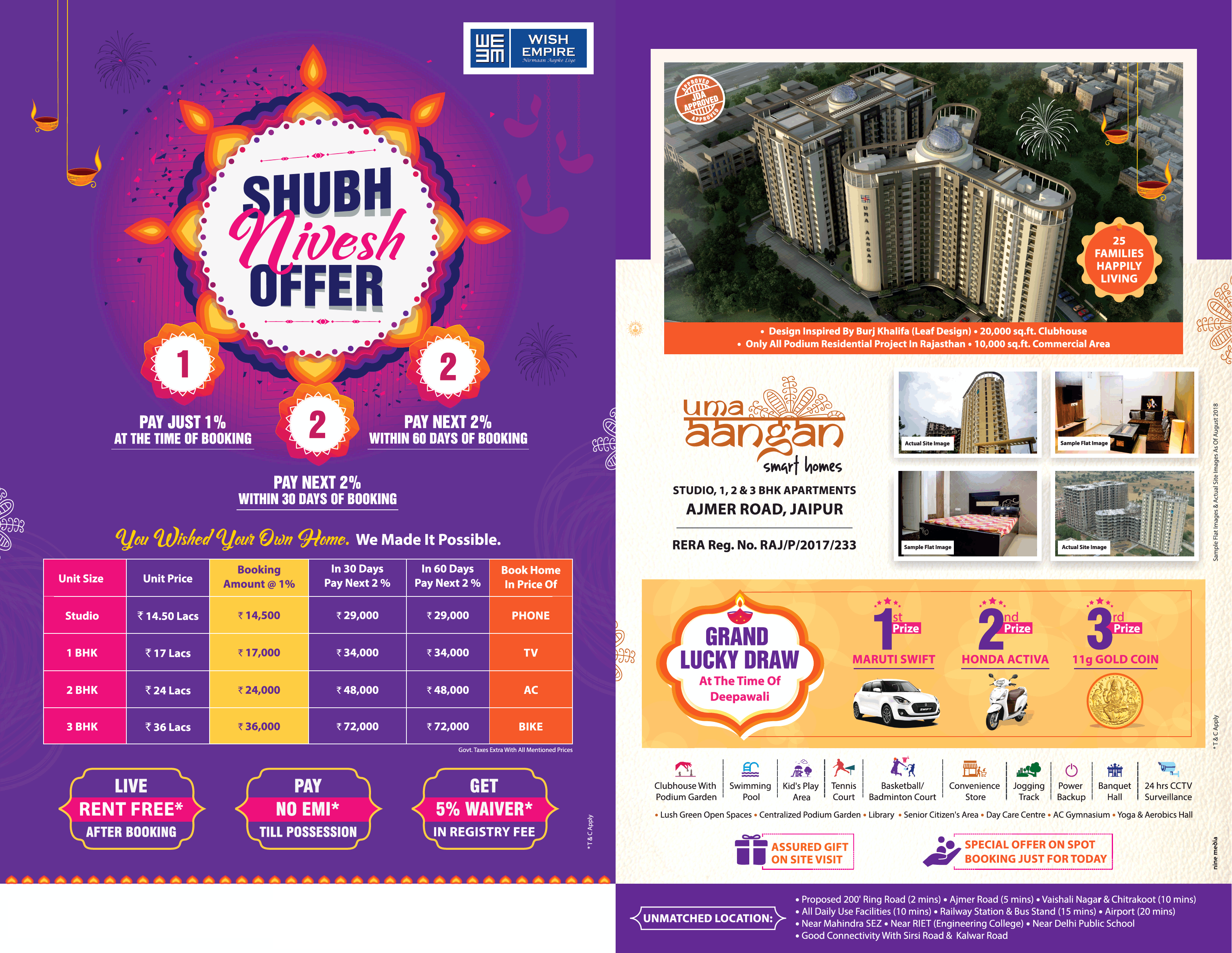 Wish Uma Aangan is a residential project developed by Wish Empire. Uma Aangan is a residential model of community living. It is located at Ajmer Road in Jaipur. The project is equipped with all modern comforts. Since its establishment in