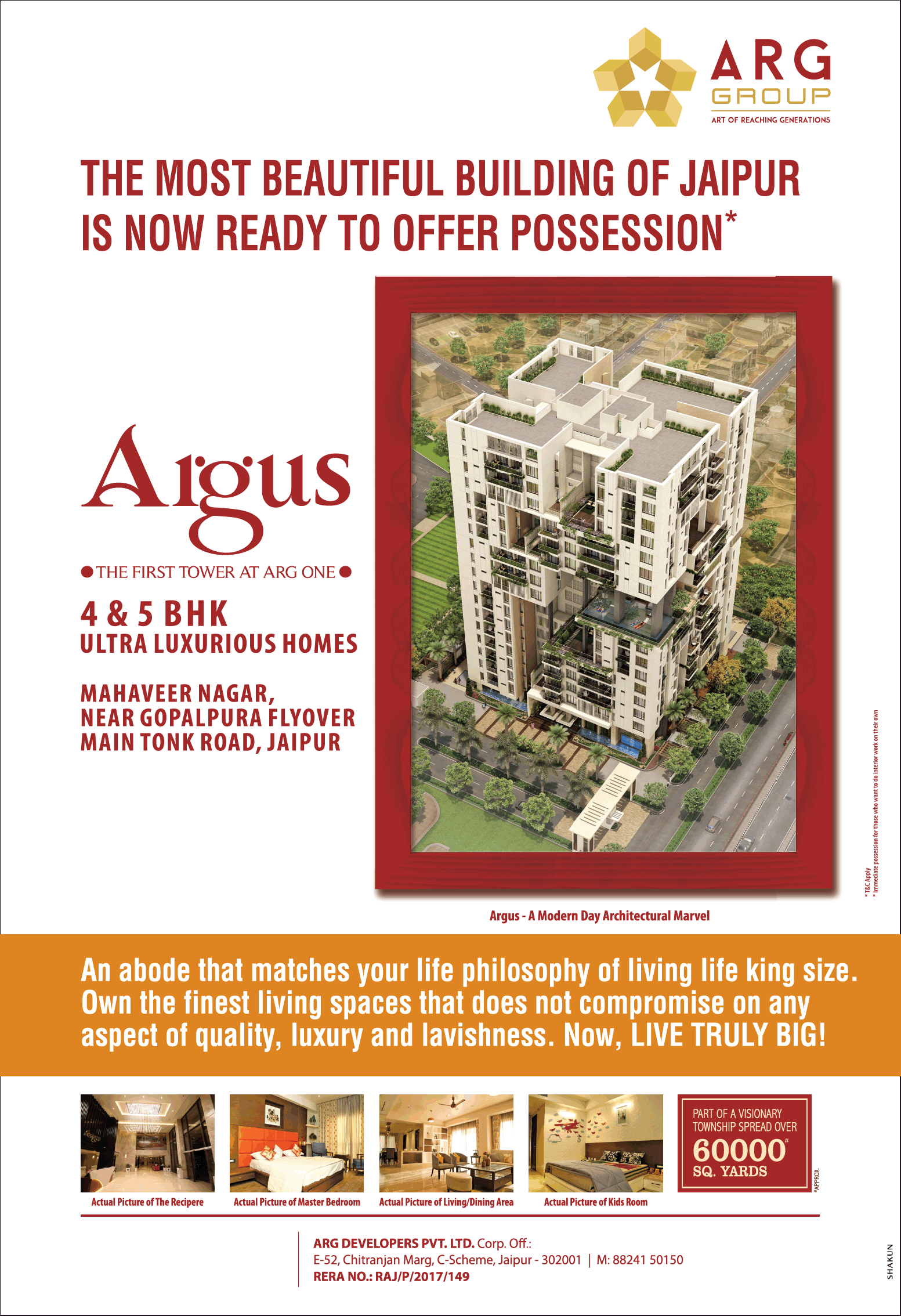 ARG One Argus is a residential project developed by the ARG Developers Pvt Ltd. The project is located in Gopalpura, Tonk Road, Jaipur. The project offers 4 & 5 BHK ultra luxurious homes.