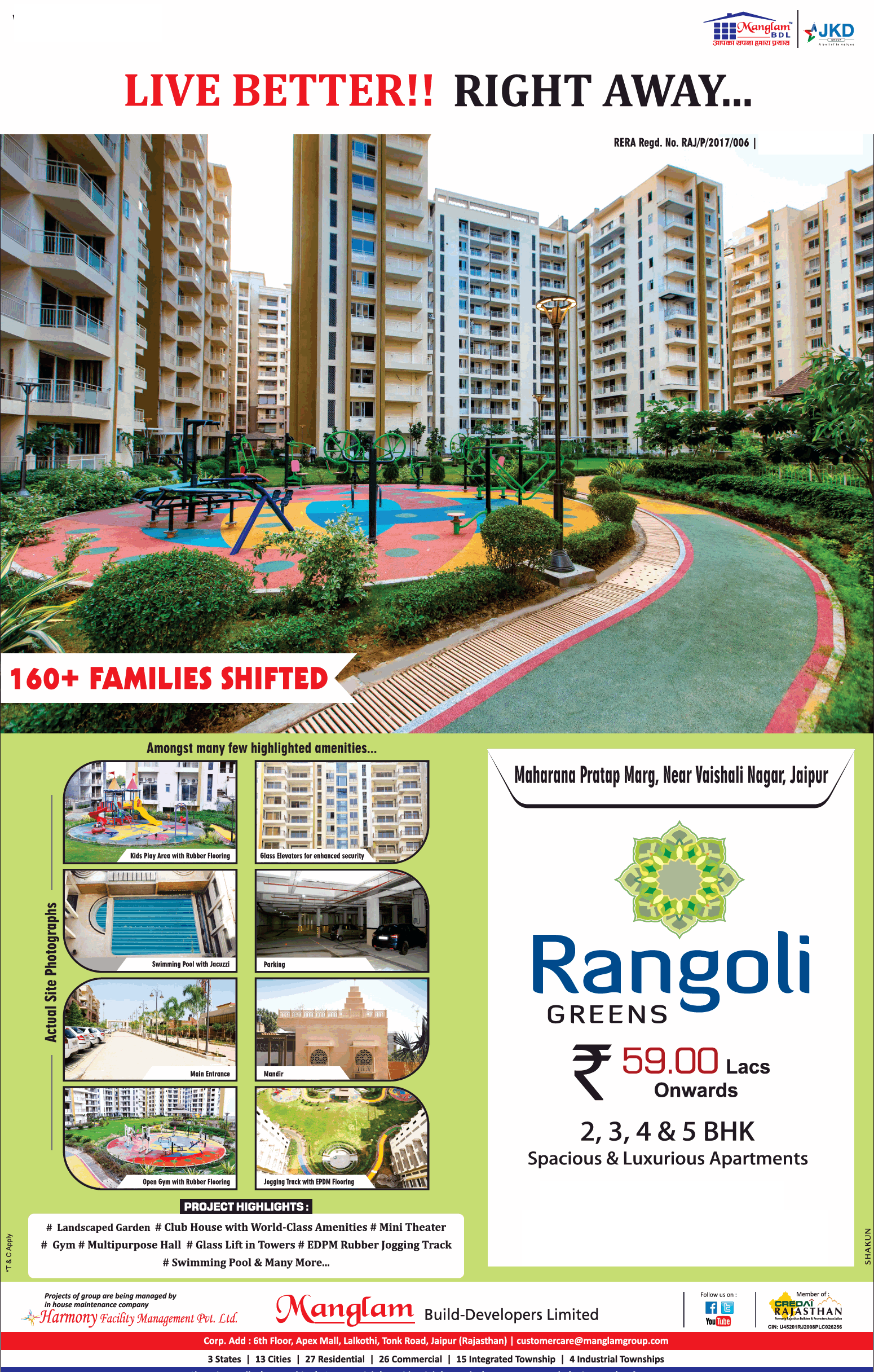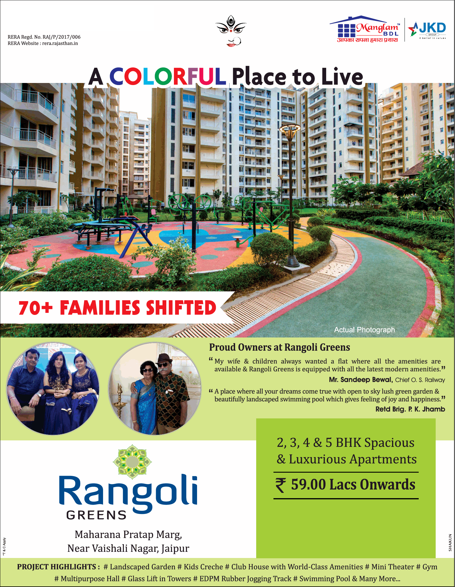 Mangalam Rangoli Greens is located in Vaishali Nagar, Jaipur. Mangalam Rangoli Greens is a premium housing project launched by Manglam Build Developers. The project offers an apartment in 2, 3, 4 and 5 B