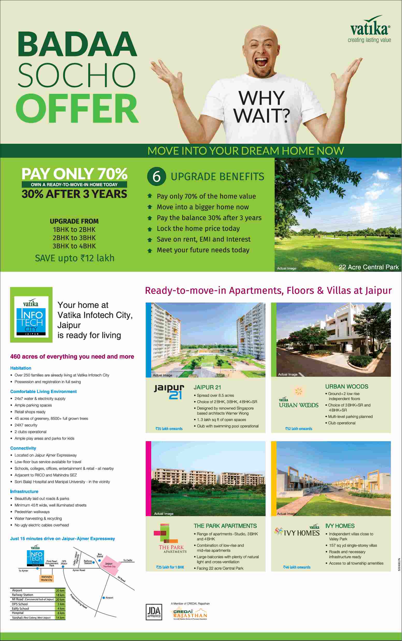 Vatika Group presents Badaa Socho Offer, move into your dream home now. Pay only 70% to own a ready to move home and rest 30% after 3 years.
