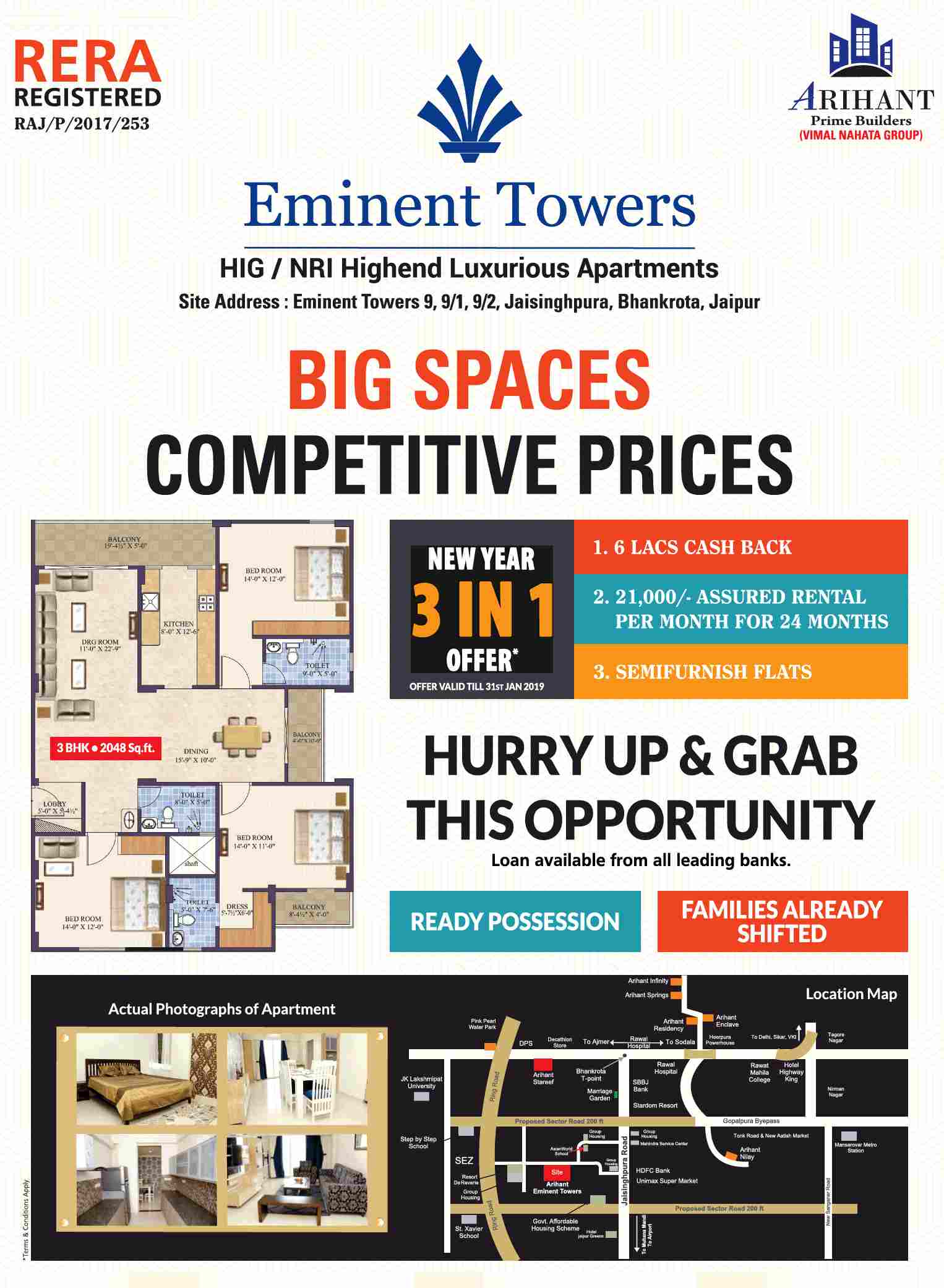 Arihant Eminent Towers is a residential project developed by the Arihant Prime Builders. The project is located in Jaisinghpura, Ajmer Road, Jaipur. The project offers ready possession 2 &