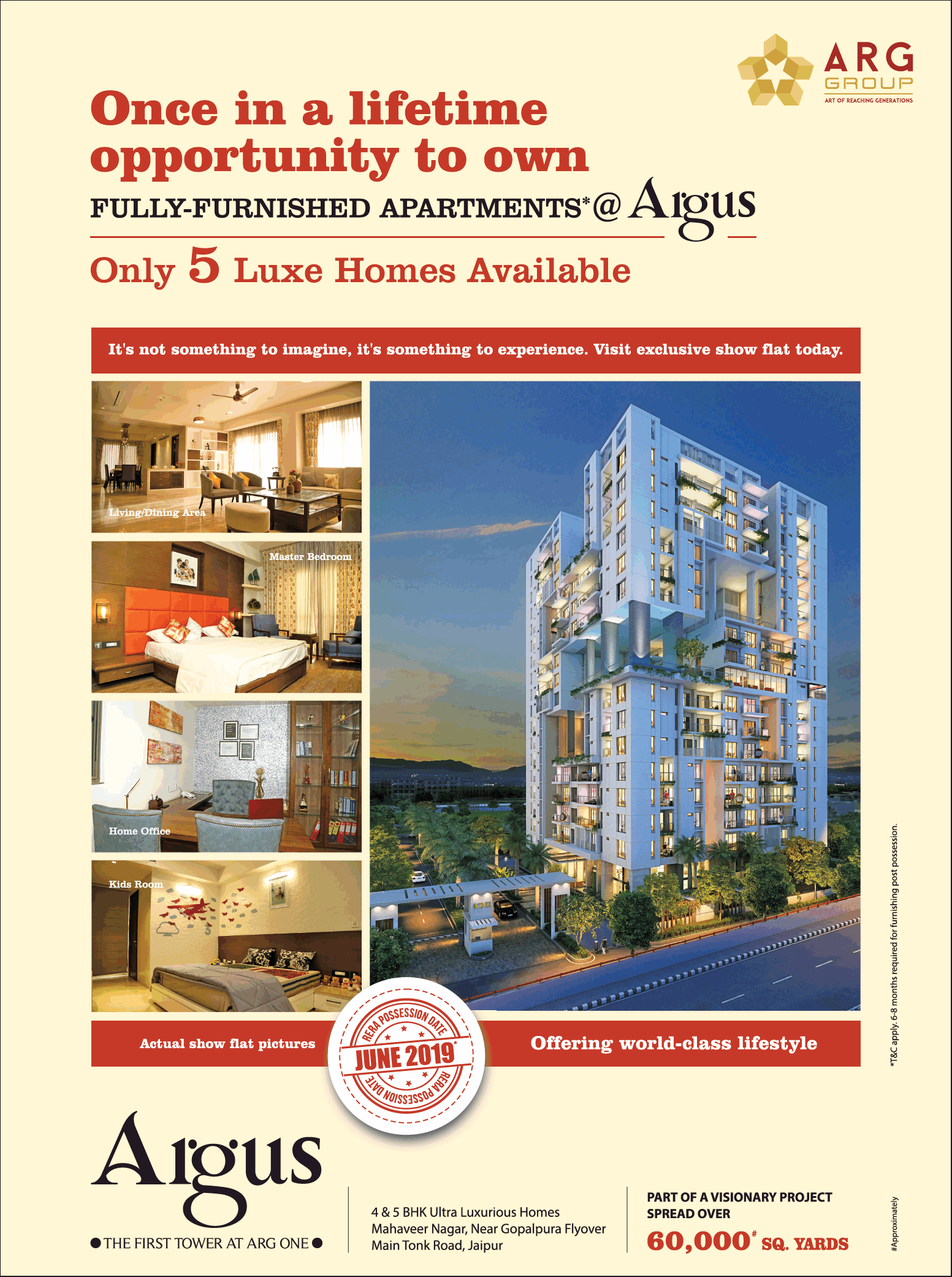 ARG One Argus is a luxurious residential project developed by the ARG Developers Pvt Ltd. The project is located in Gopalpura, Tonk Road, Jaipur. The project spreads over 60,000 sq. yards an