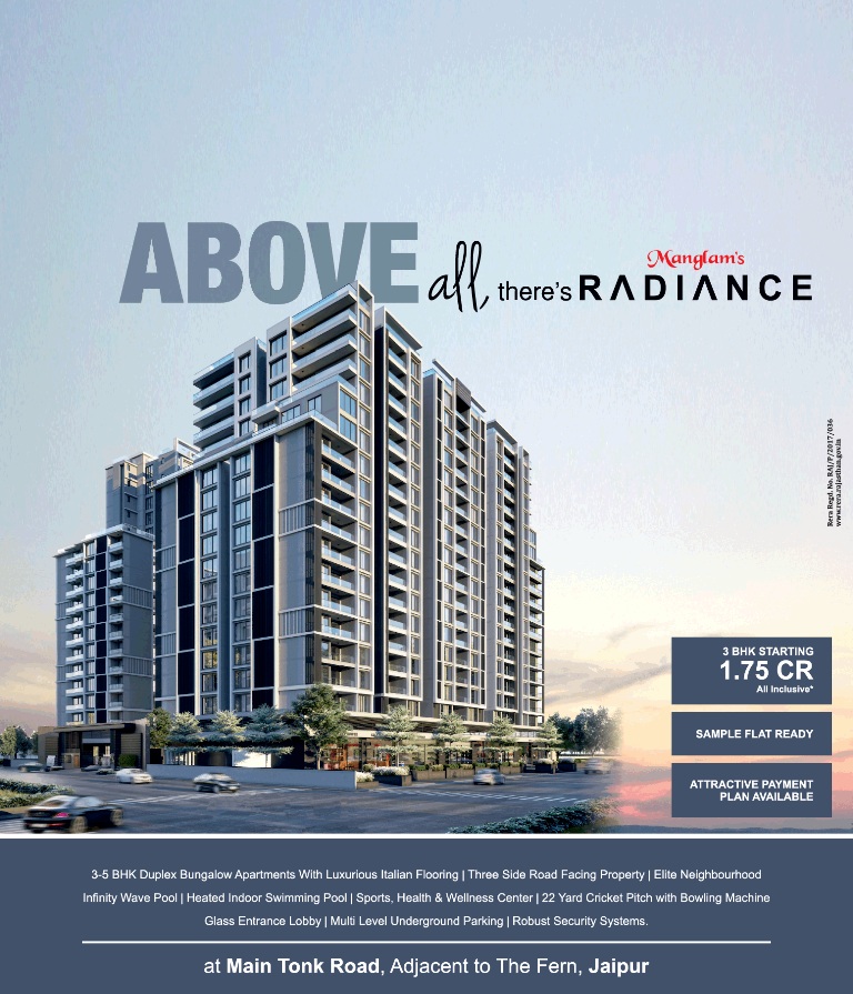 Manglam Radiance is a residential project developed by Manglam Group. The project is located in Tonk Road, Jaipur. Buy 3/4/5 BHK Luxury Flats at Tonk Road at Manglam Radiance. The project is lo