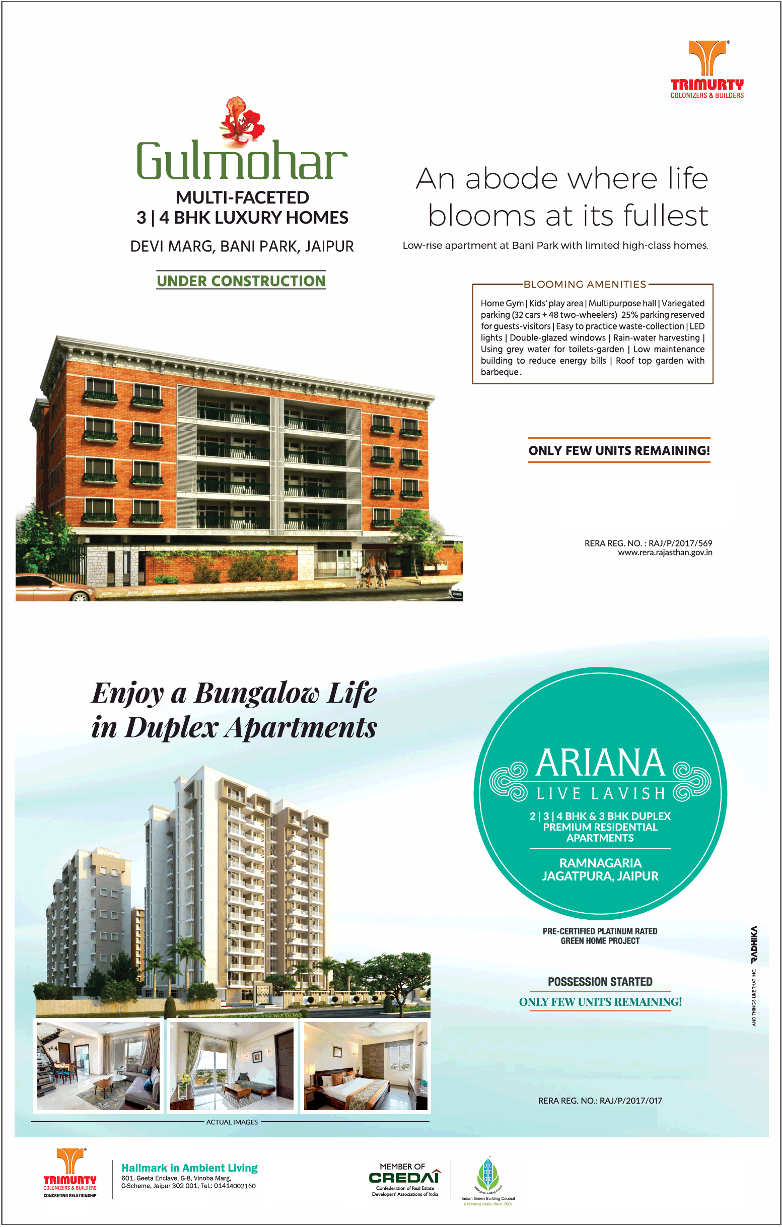 Trimurty Ariana is a residential project developed by the Trimurty Colonzers & Builders Pvt Ltd. The project is located in Jagatpura, Jagatpura Road, Jaipur. The duplex apartments