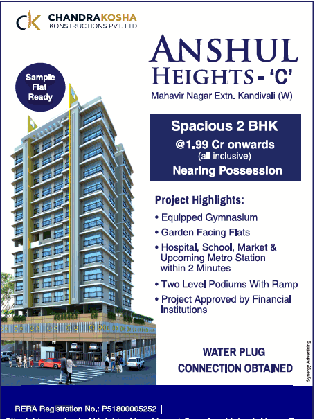 Chandrakosha Anshul Heights is developed by Chandrakosha Constructions Private Ltd and is located at Kandivali East in Mumbai. It has 2 BHK apartments that range from 720 square foot to 730 square foot. The project comes with basic facil