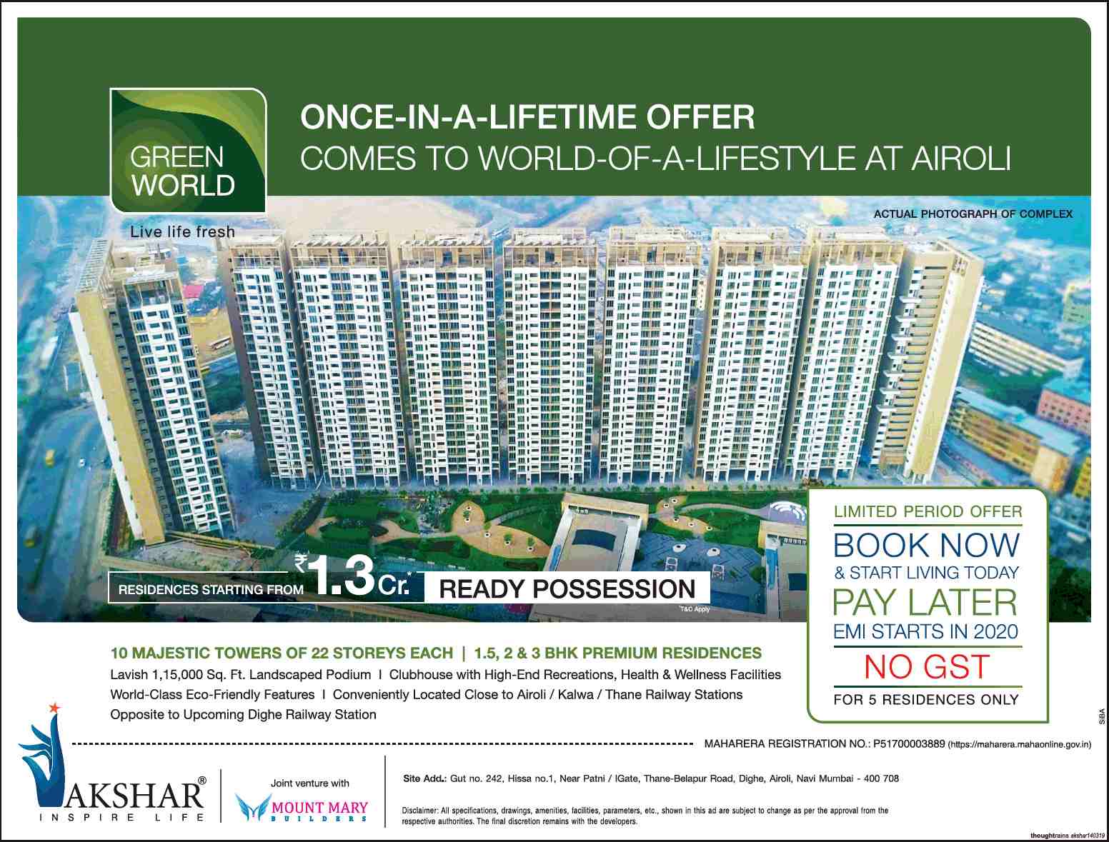Akshar Green World is a luxurious residential project developed by Akshar Group. The project is located in Airoli, Thane Belapur Road, Navi Mumbai. The project has 10 majestic towers of 22 storeys each comprising of 1