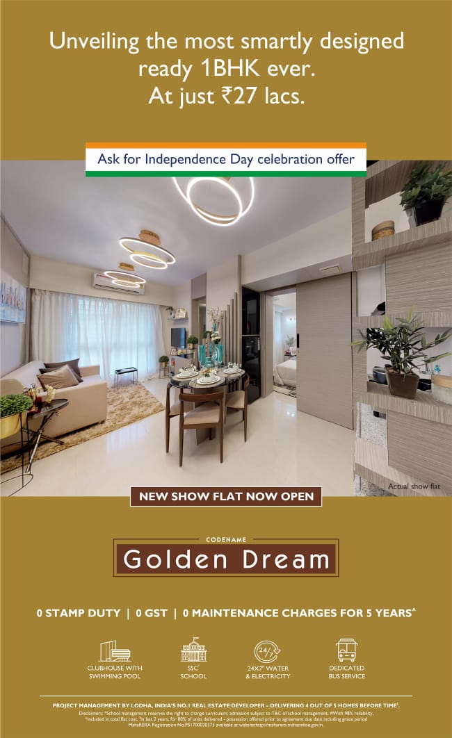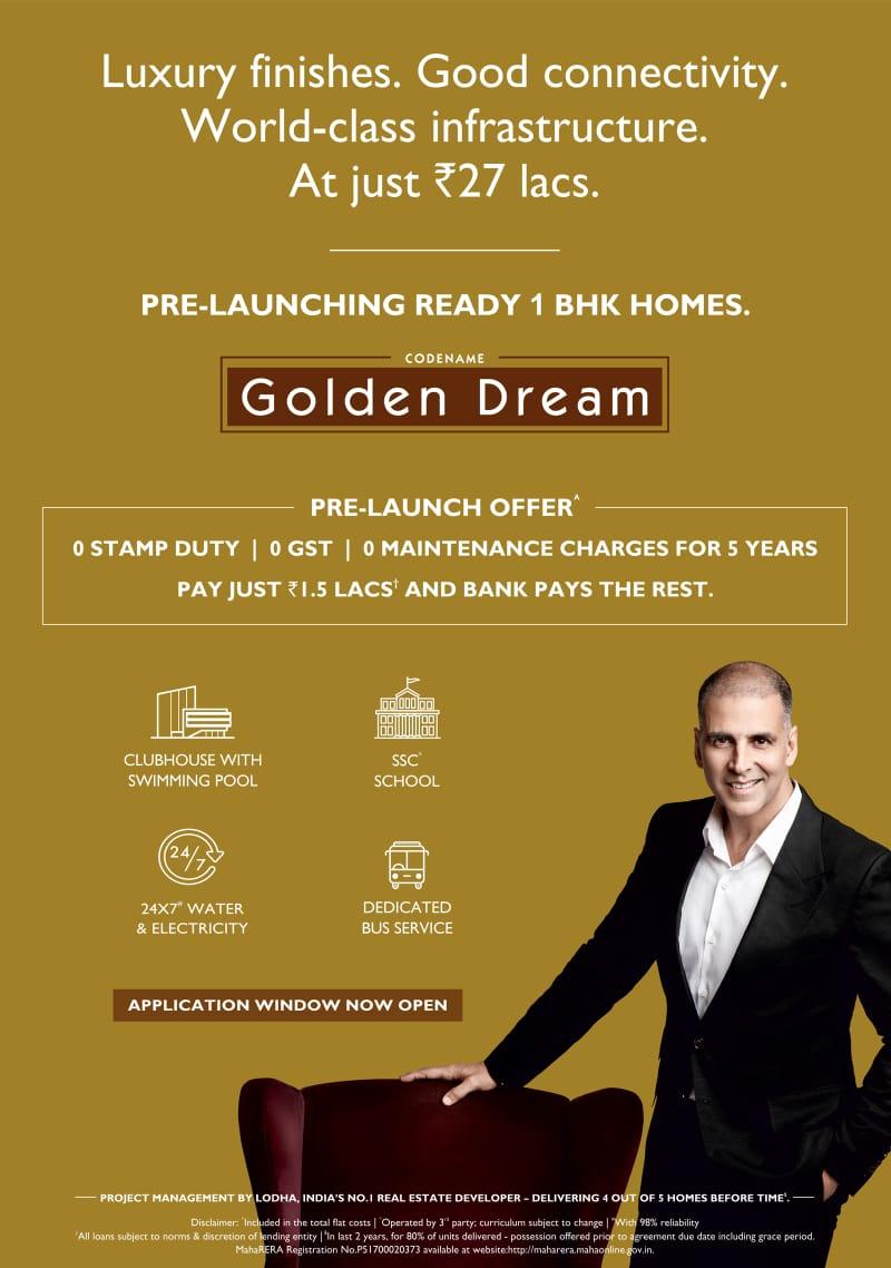 Lodha Codename Golden Dream Taloja is a premium housing project newly launched by Lodha Group in Taloja, Navi Mumbai. The Lodha Codename Golden Dream Taloja, Navi Mumbai are available from 305 sqft to 380 sqft.