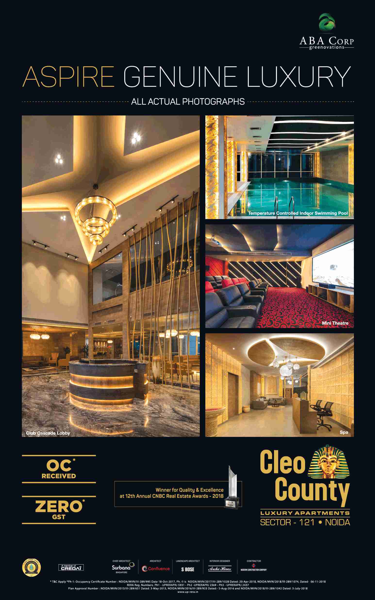 ABA Cleo County is a prime residential project which is situated in the posh locality of Sector-121, Noida. The entire residential project is inspired by Egyptian architecture. ABA Cleo County provides a