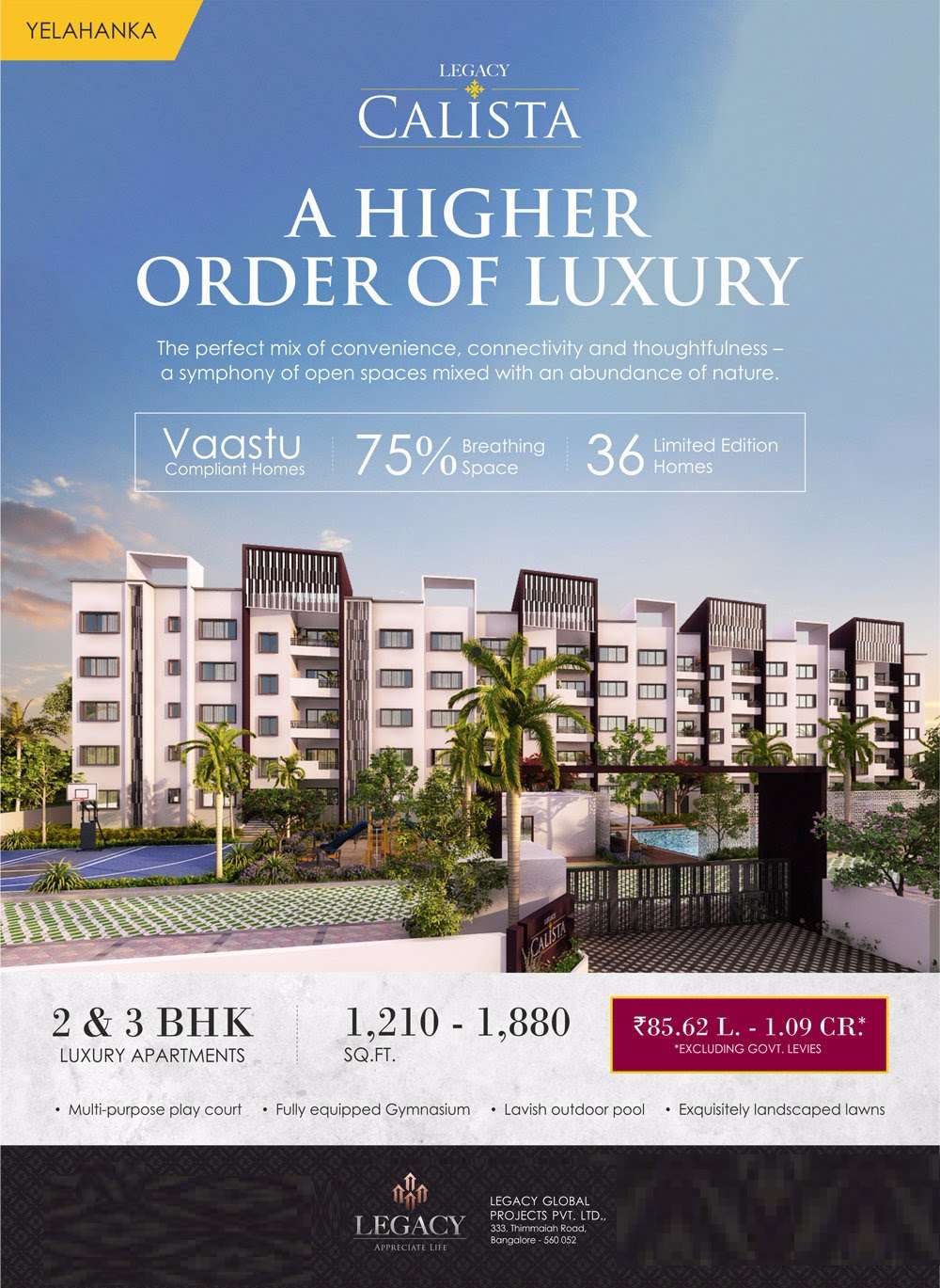 Legacy Calista is a residential project developed by the Legacy Global Projects Pvt Ltd. The project is located at Yelahanka New Town, Doddaballapur Road, Bangalore. The project is a higher order of