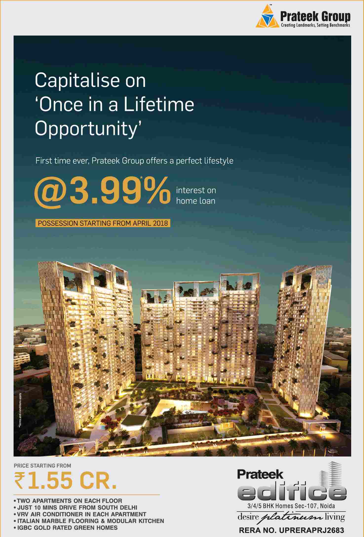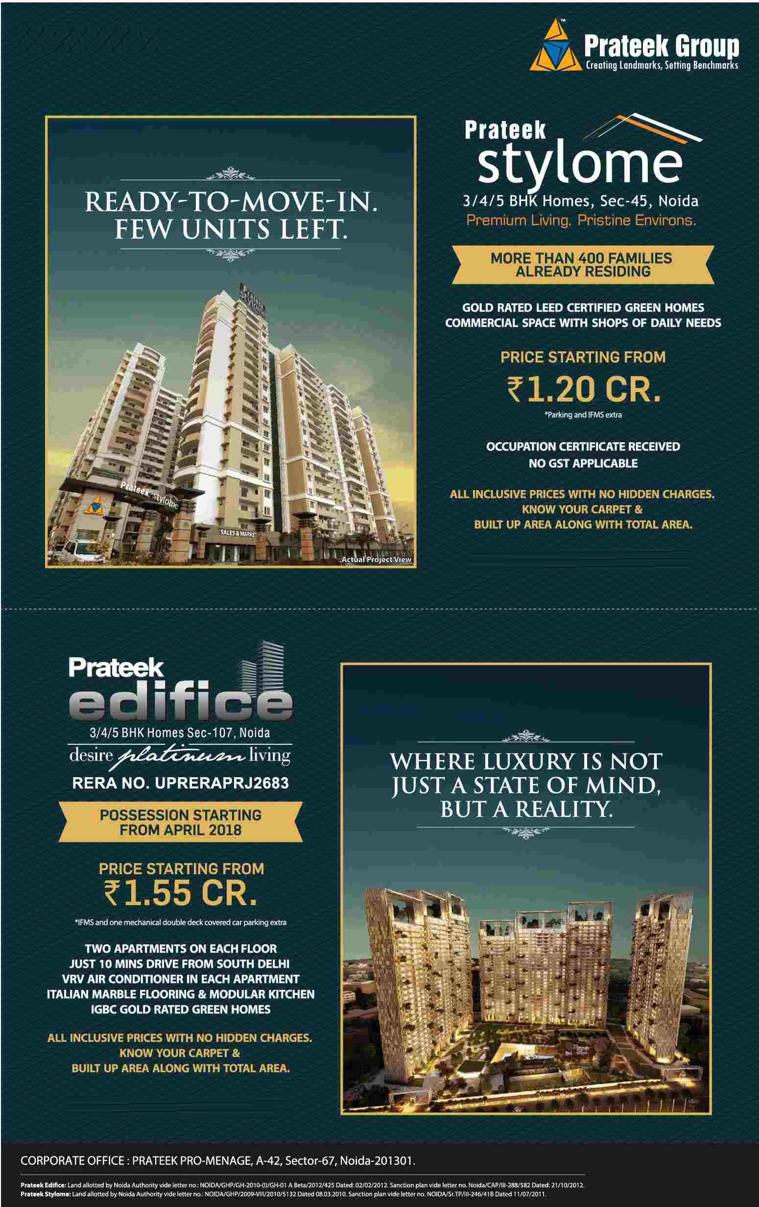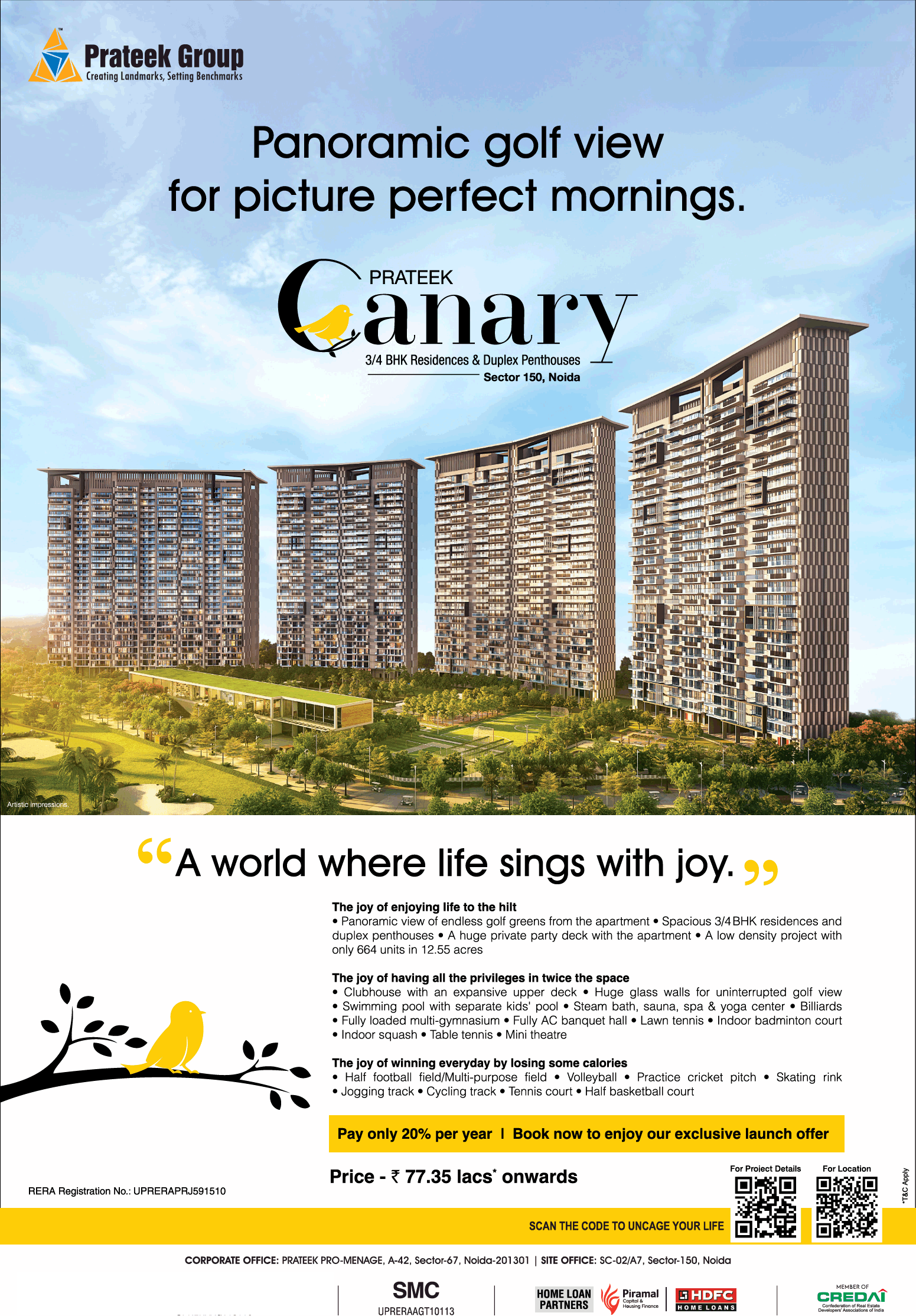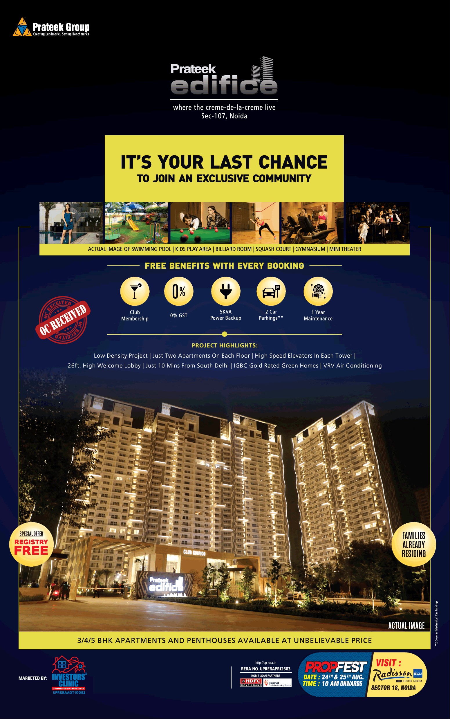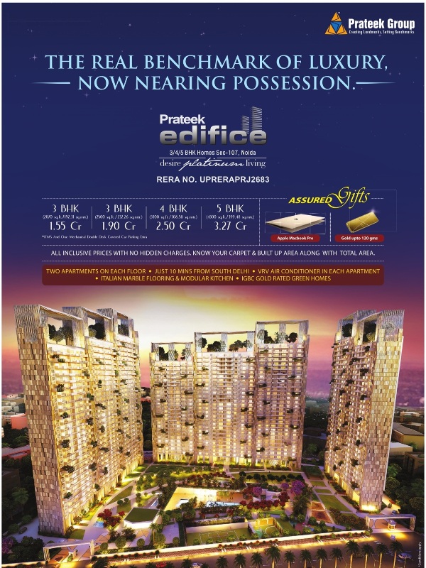 Prateek Edifice is a residential project located at Sector 107, Noida. The project has been appreciated as it offers 3BHK small and large, 4BHK and 5BHK apartments. These apartments range from super areas of 2,070 sq. ft. to 4,300 sq. ft