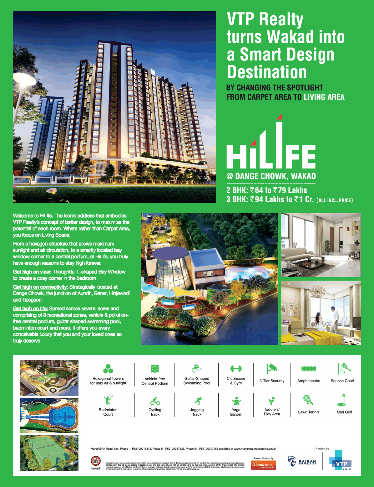 VTP Realty HiLife is a Residential project with 2 BHK and 3 BHK flats in Wakad, Pune displays unique hexagonal shaped towers with 20 floors that castle over surrounding buildings. Thus, making it the ideal ho