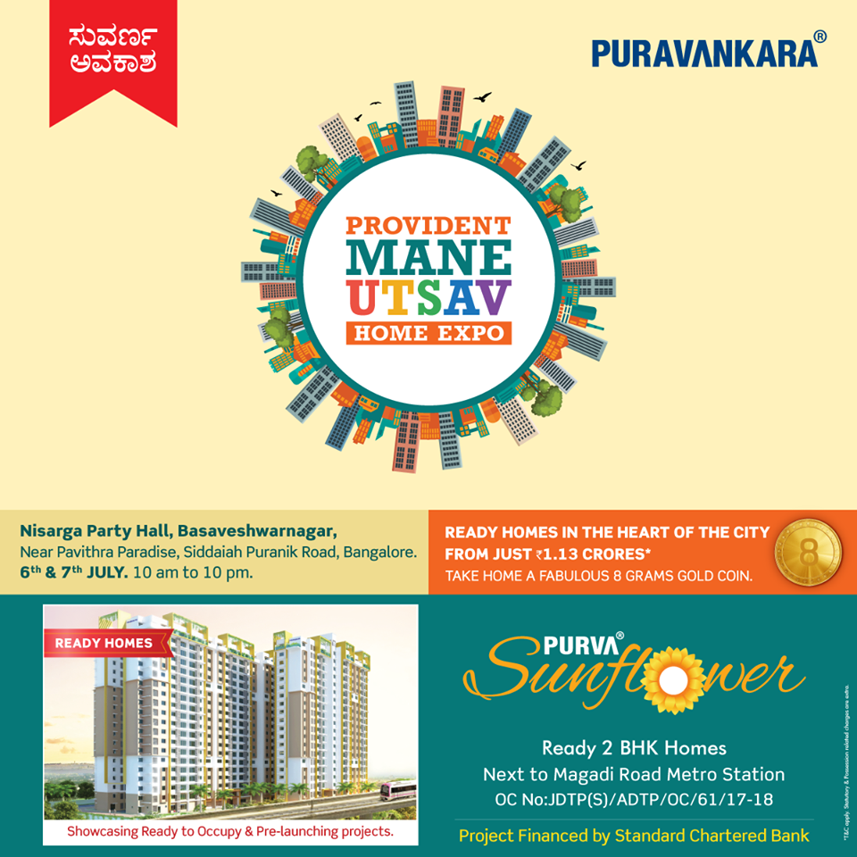 Nisarga Party Hall, Basaveshwarnagar, Near Pavithra Paradise, Siddaiah Puranik Road, Bangalore. 6th & 7th July, 10 Am To 10 Pm. Ready Homes In The Heart Of The City From Just 31.13 Crores. Take Home A Fabulous 8 Grams Gold Coin. Ready 2 Bhk Homes Next To Magadi Road Metro Station
