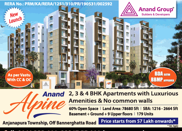 Spacious apartment with luxurious amenities and no common walls are available in Anand Apline, Bangalore