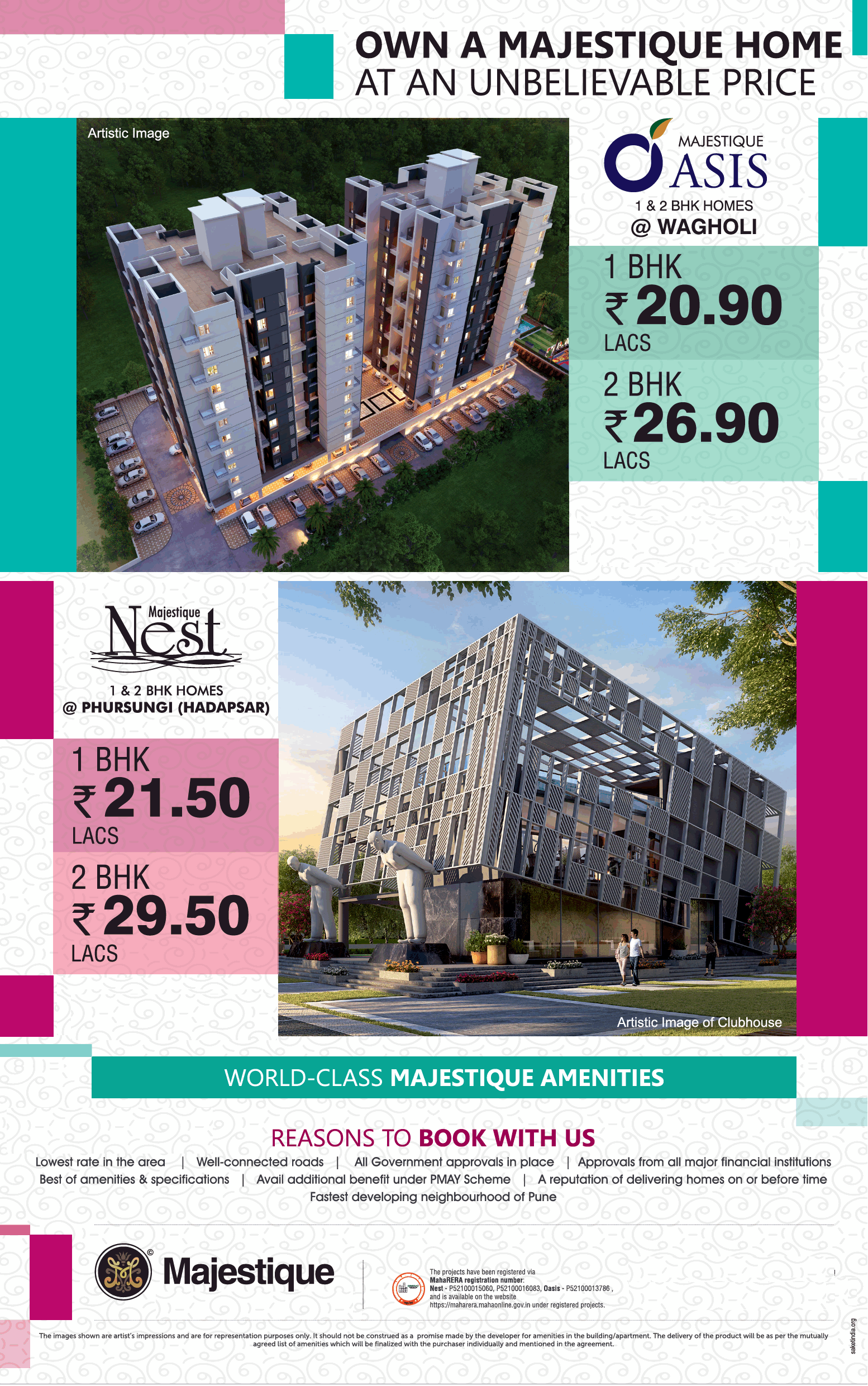 Majestique Manhattan is a residential project located at Wagholi, Wagholi Kesnand Road, Pune. It is a unique project which offers 1 and 2 BHK homes and completes the package with a number of useful features and
