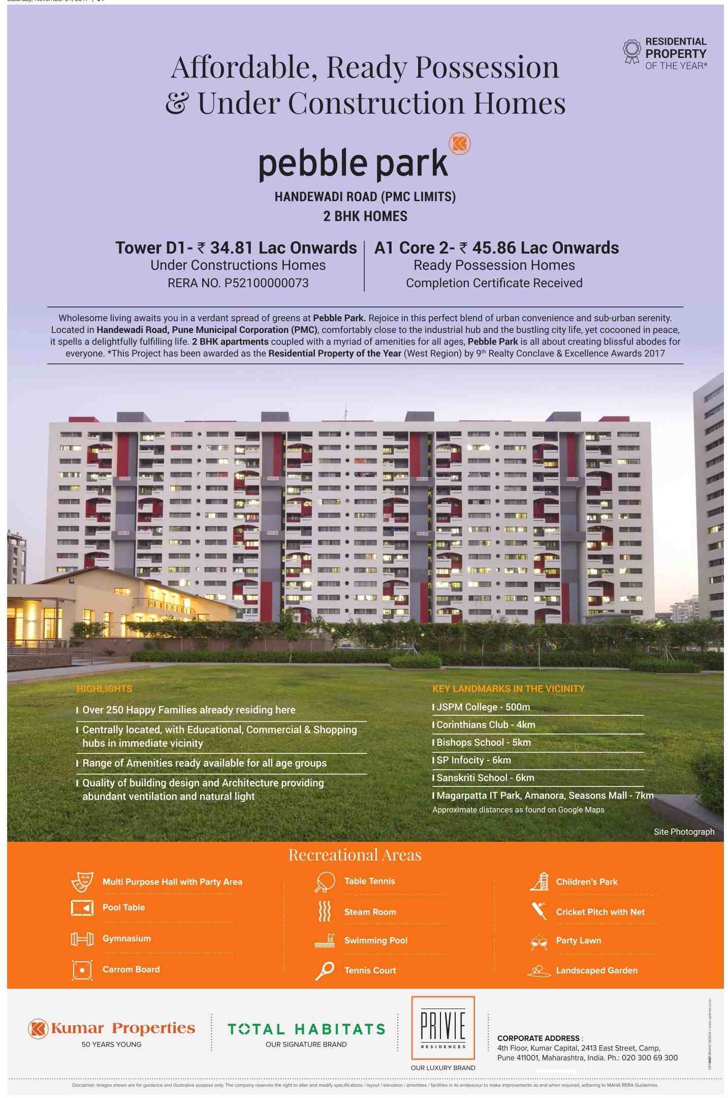 Kumar Pebble Park is a residential project developed by the Kumar Properties Pvt Ltd. The project is located at Handewadi, Handewadi Road, Pune. The project offers 2 BHK homes.
