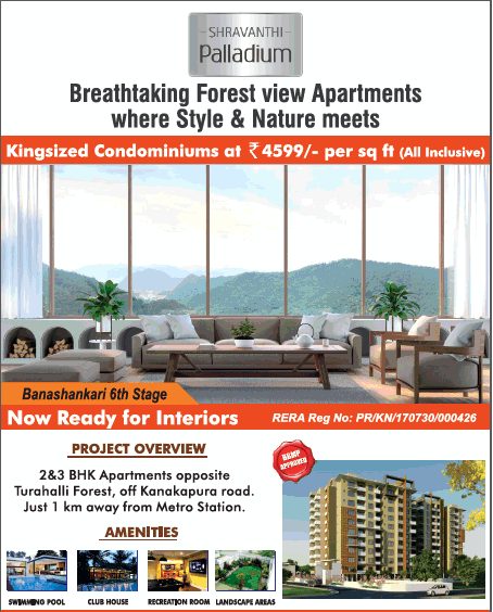 Palladium is a residential project developed by the Shravanthi Group. The project offers breathtaking forest view apartments where style and nature meet. Kingsized condominiums at Rs. 4599 per sq. ft. all inclu