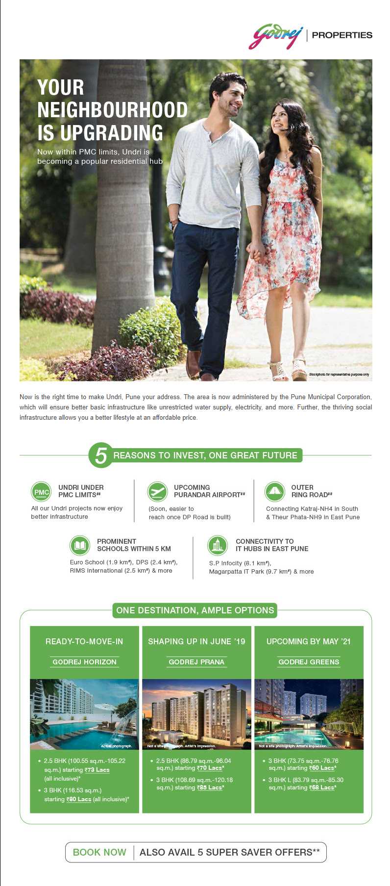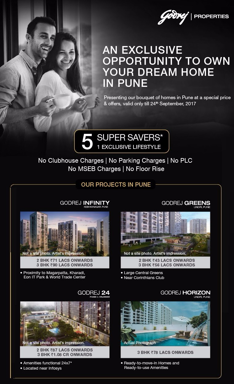 An exclusive opportunity to own your dream home in Pune. Godrej properties present bouquet of homes in Pune at a special price & 5 super saver offer, valid only till 24th September 2017. 5 super saver offer