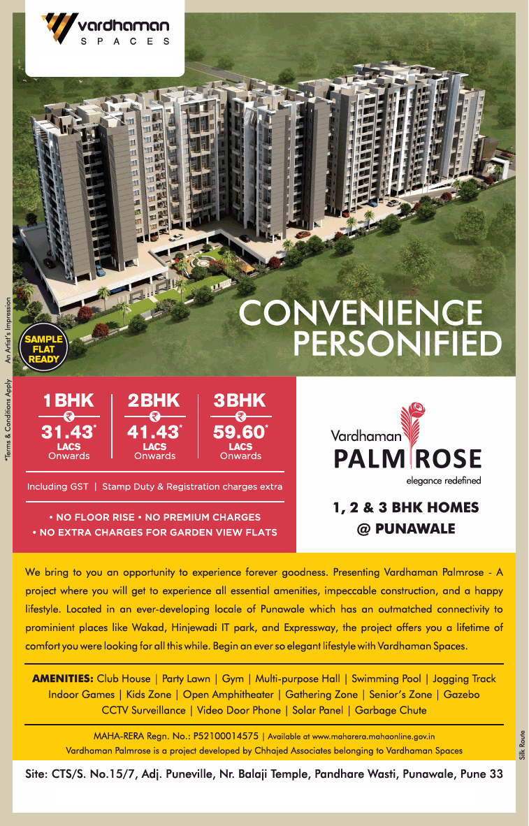 Palmrose is a residential project developed by the Vardhaman Spaces. The project is located at Punawale, Pune. The project offers 1, 2 & 3 BHK kingsize homes.