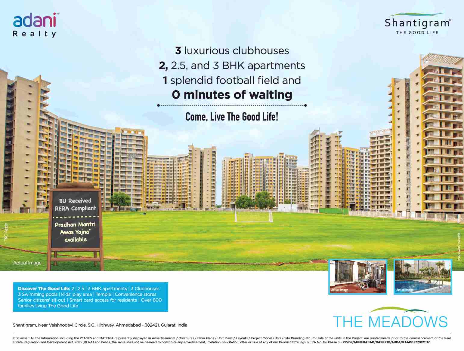 Adani Shantigram Meadows a residential project located at Vaishno Devi Circle in Ahmedabad. Adani Shantigram Meadows offers well designed 2, 3 BHK apartments to buyers and spreads over an area of 27 acres in all. Average apart