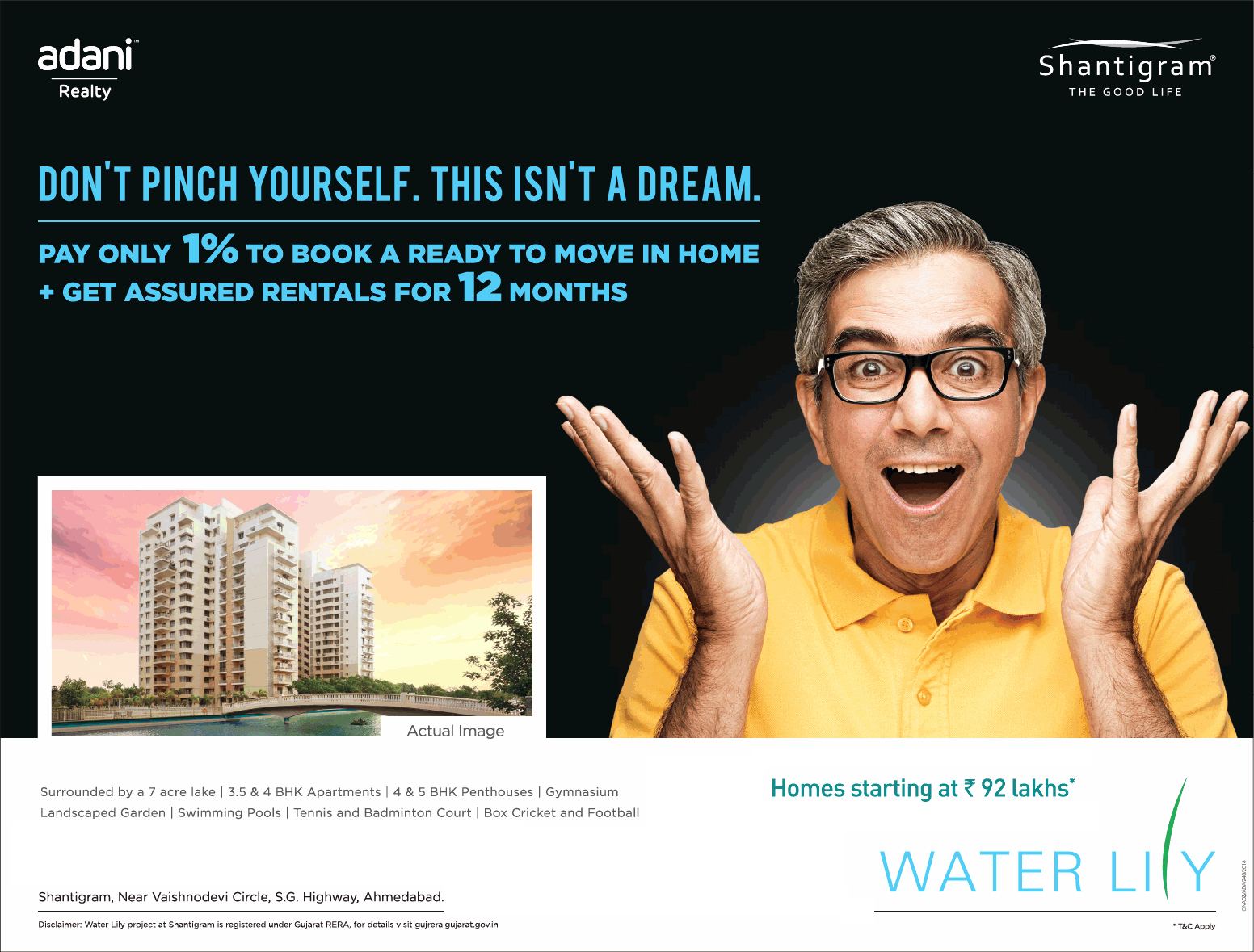 Adani Shantigram Water Lily is a residential project located at Vaishno Devi Circle in Ahmedabad. Adani Shantigram Water Lily offers well designed 3, 4, 5 BHK apartments and 4 & 5 BHK pent