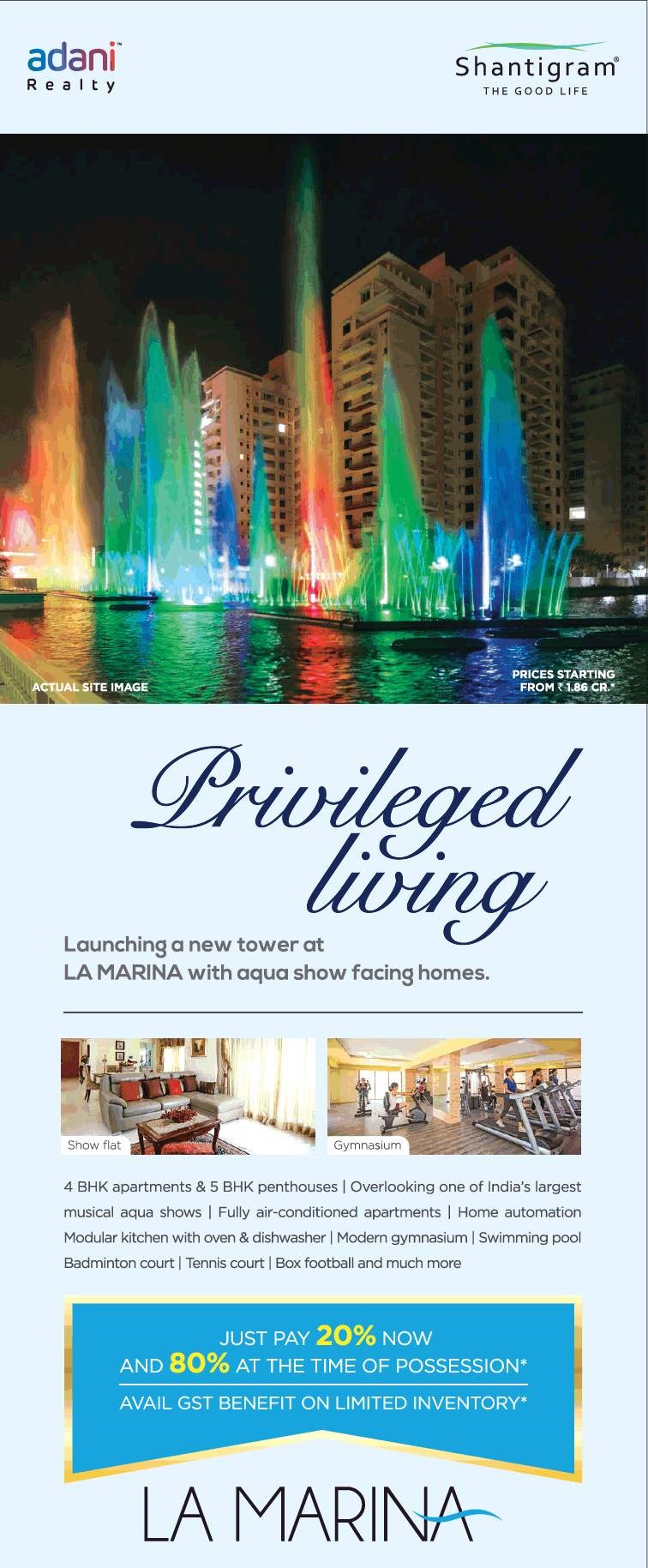 Adani Shantigram La Marina is a residential project developed by the Adani Group. The project is located in Vaishnodevi Circle, SG Highway, Ahmedabad. Launching a new tower at La Marina with aqua show
