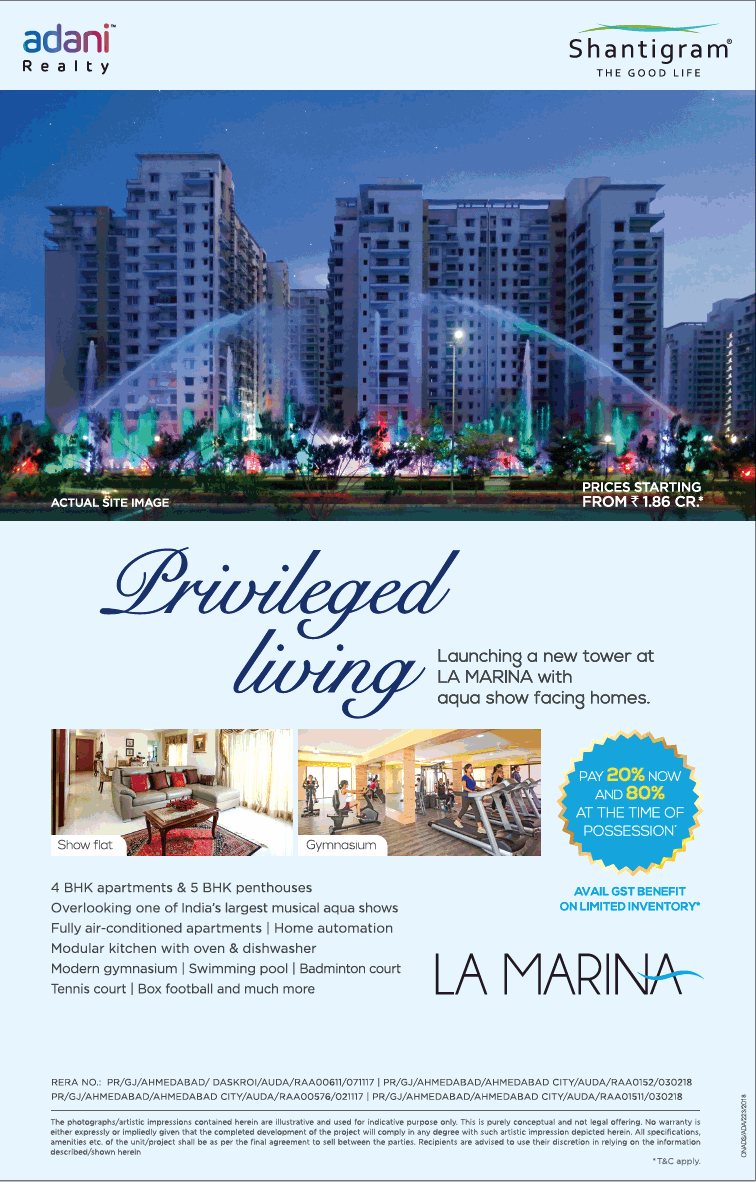 Adani Shantigram La Marina is a residential project located at Vaishno Devi Circle in Ahmedabad. Adani Shantigram La Marina offers well designed 4, 5 BHK apartments and villa to buyers and sprea