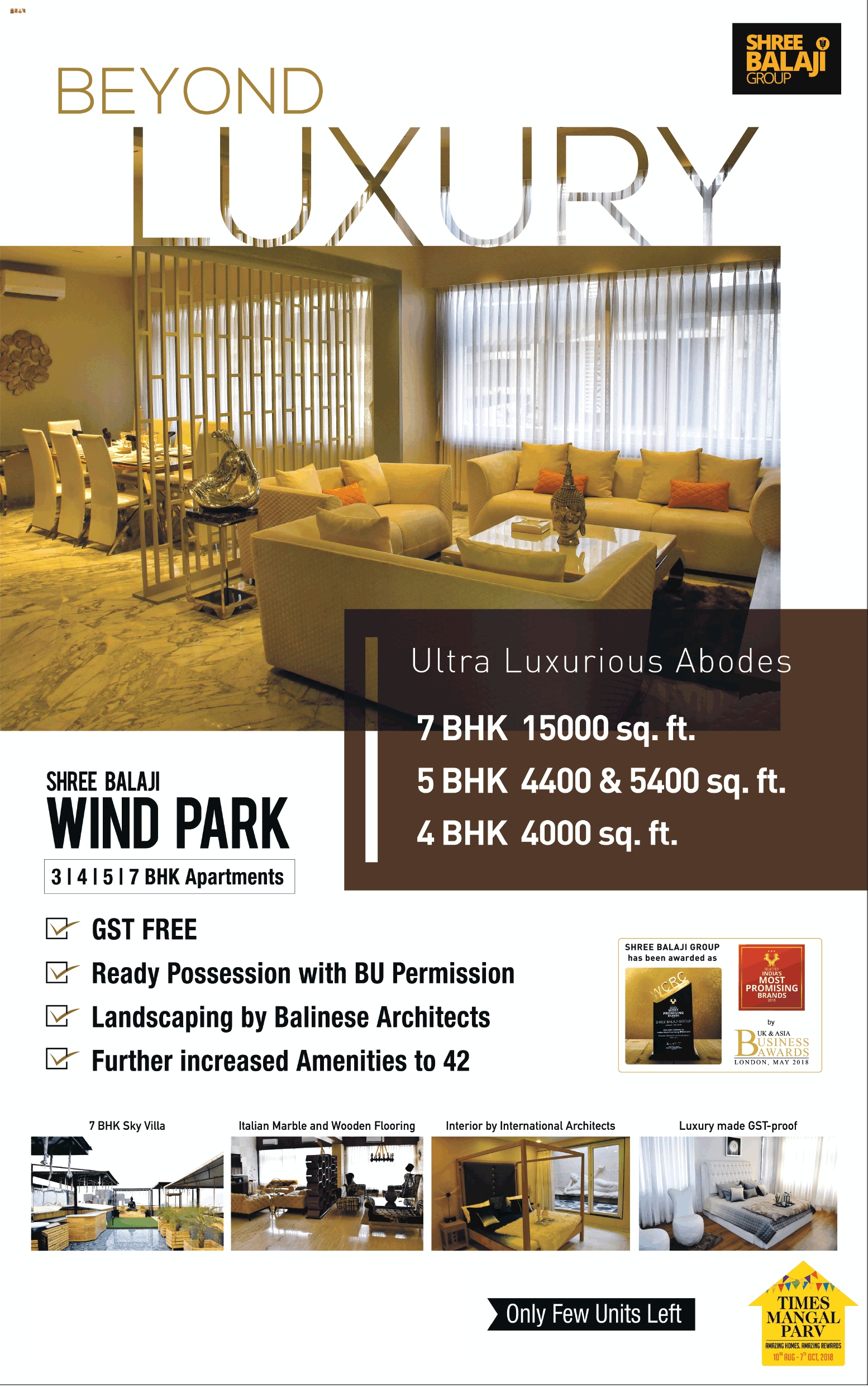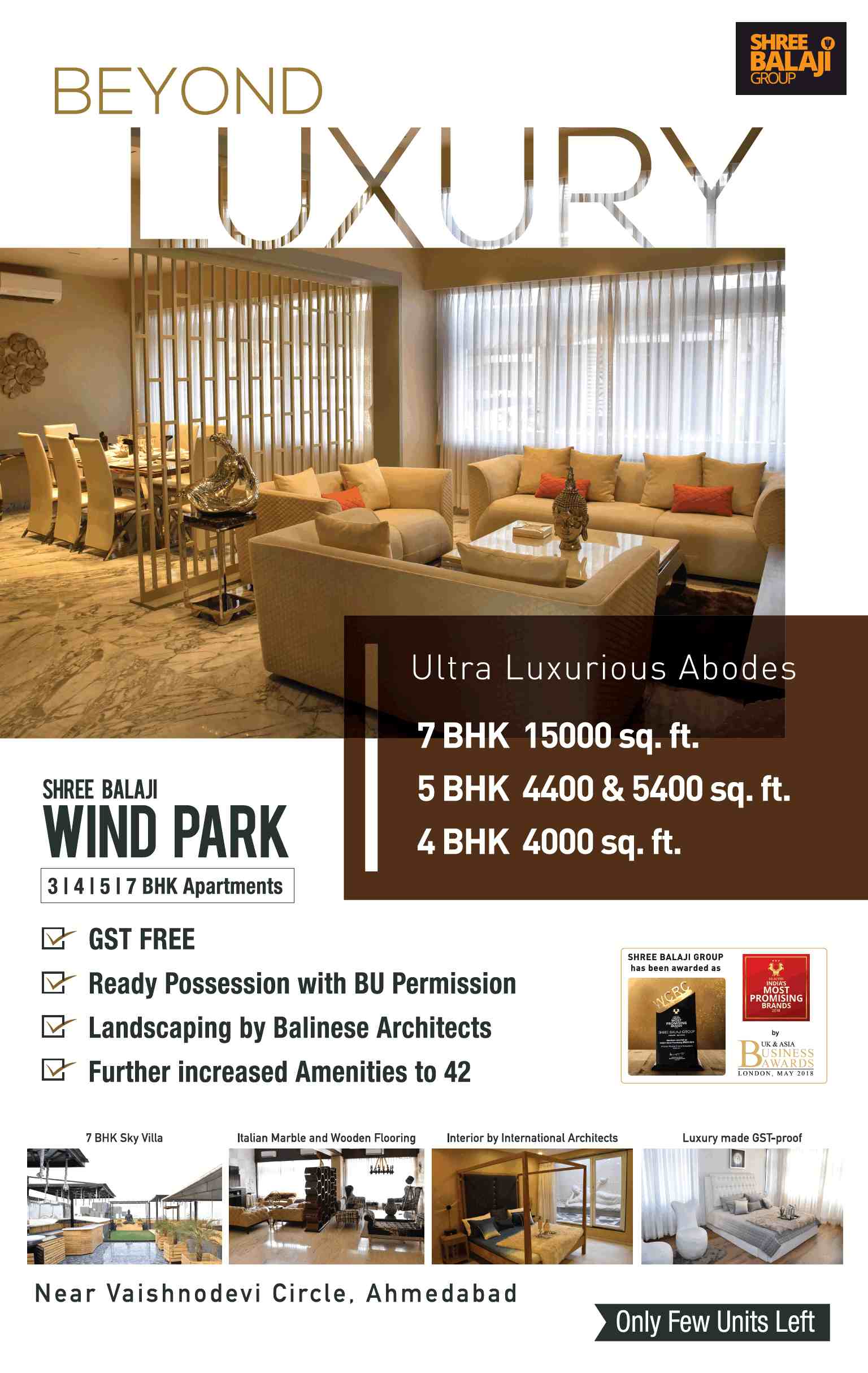 Shree Balaji Wind Park is a luxurious residential project developed by the Shree Balaji Group. The project is located in Vaishnodevi Circle, Sardar Patel Ring Road, Ahmedabad. The project offers 3, 4,