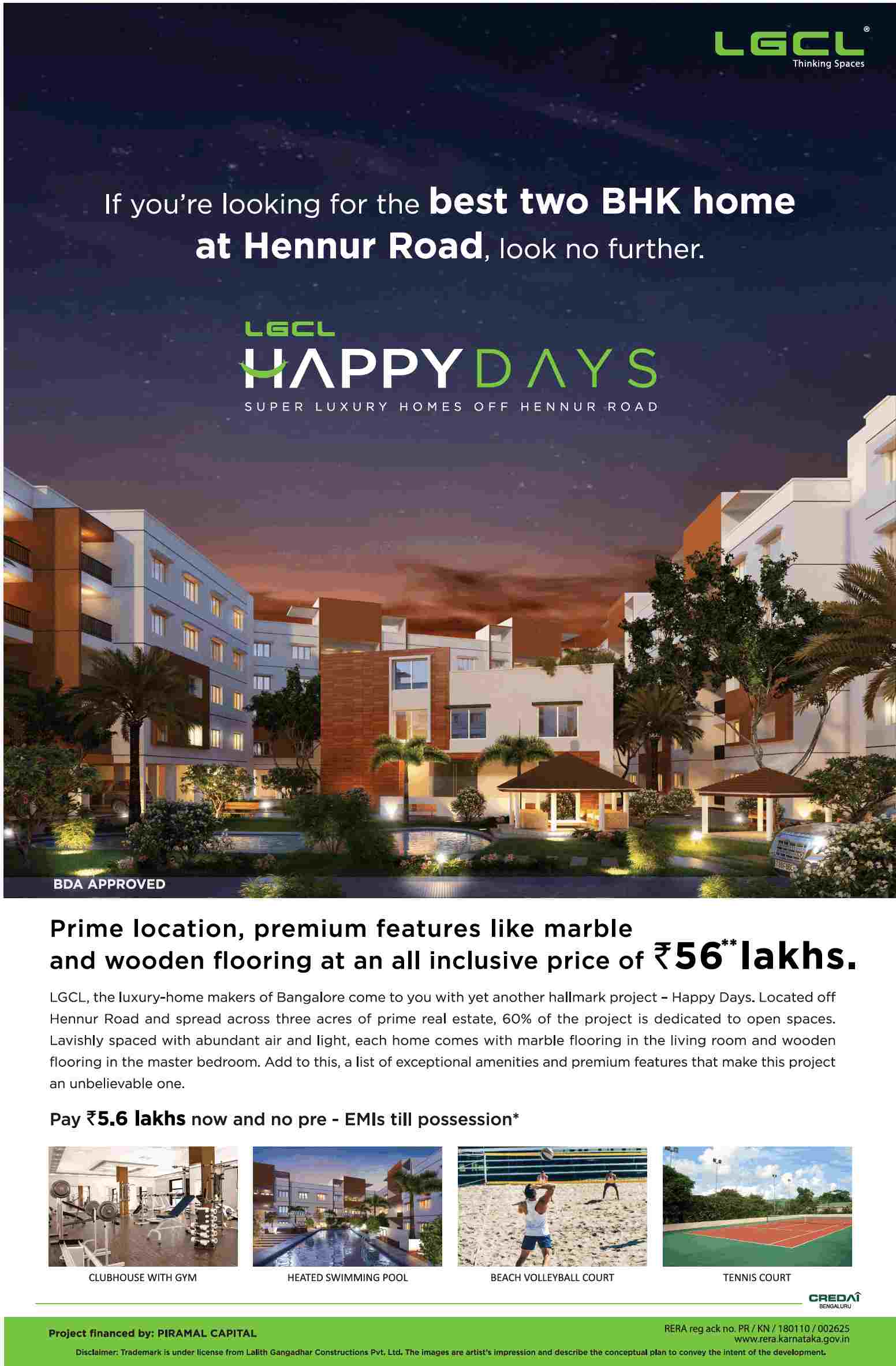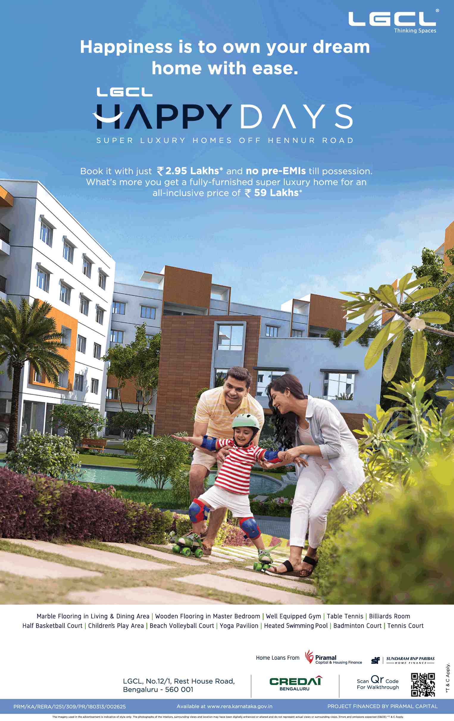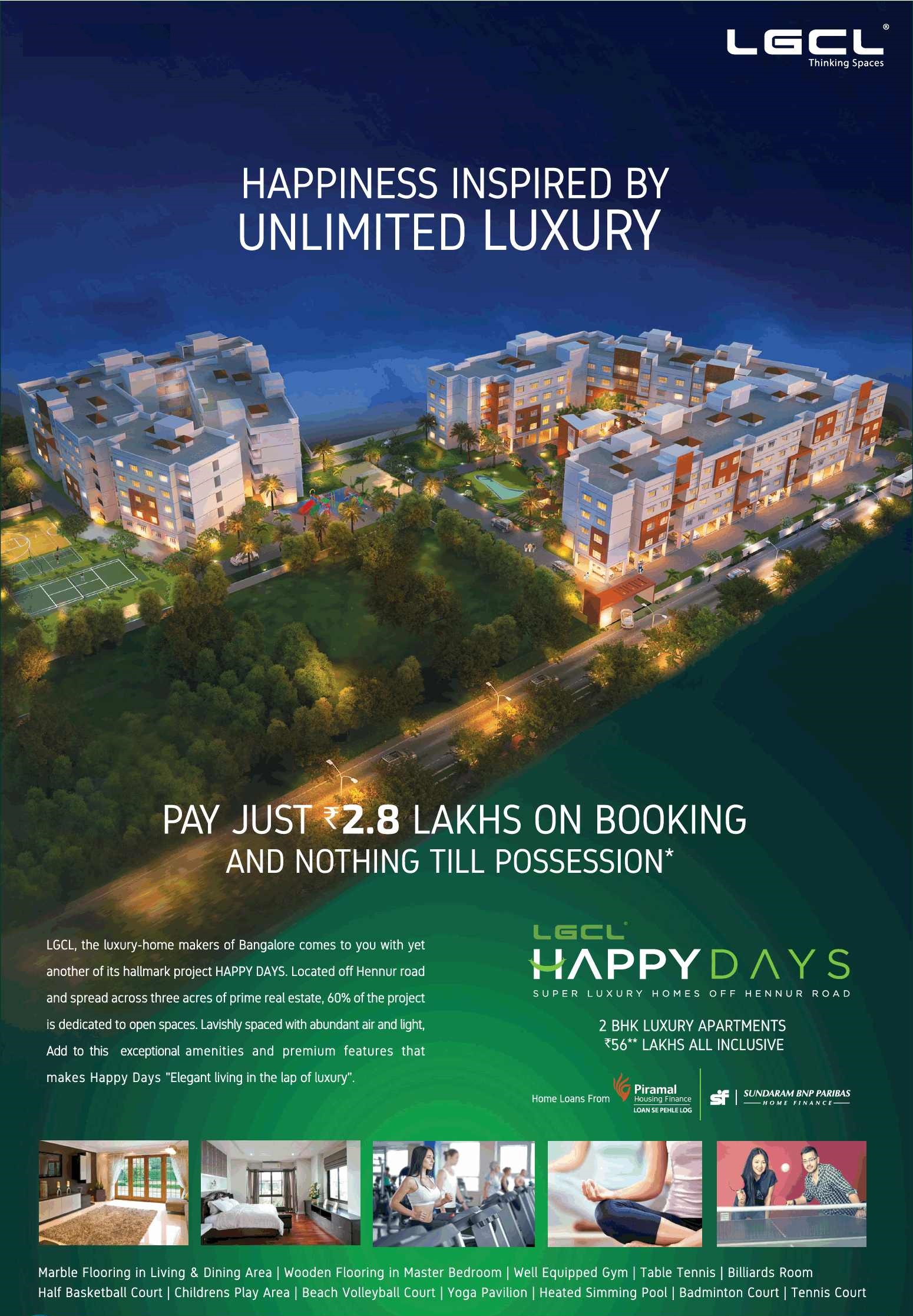 Located off Hennur road, Happy Days is a testament to what LGCL stands for –Superiority in every sphere, product, quality, location, amenities, features, specifications, and price. Happy Days offers 237 Two BHK apartments on a 3-ac