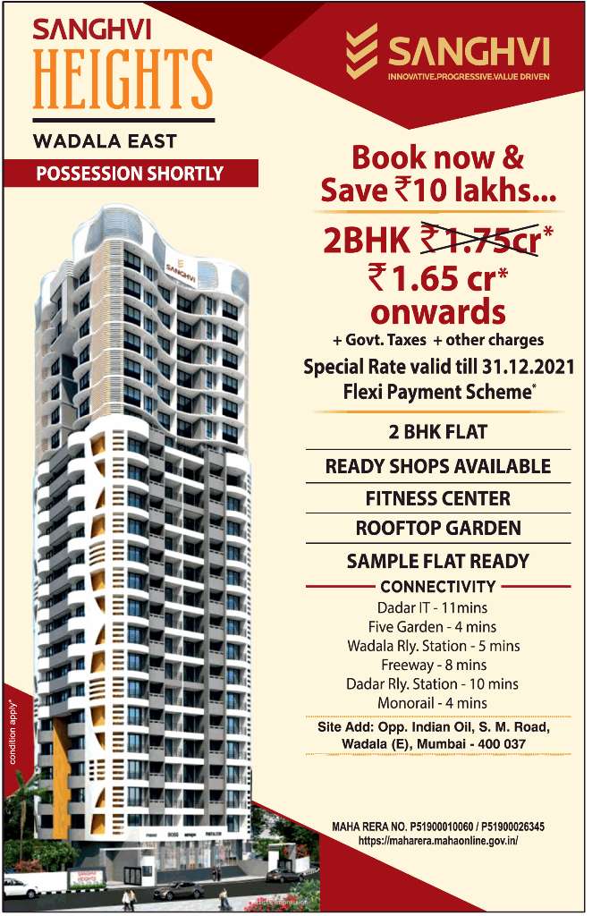 Sanghvi Heights is located in Wadala. The Sanghvi Group of Companies is one of the few established leading construction houses with their main thrust on Residential Projects. Sanghvi Heights at Wadala in