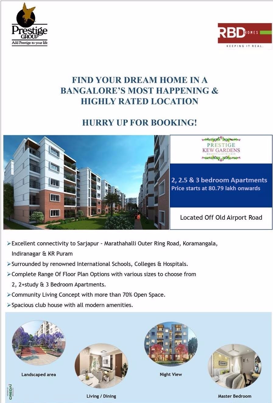 Just off Old Airport Road at Bengaluru, coming up is a wonderfully picturesque urban residential community that offers a life that is full of comfort, blessed by the colours and fragrances of nature. Prestige Kew Gardens brings in a slic