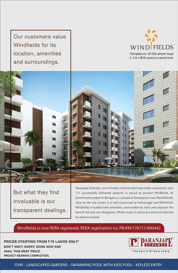 Paranjape Wind Fields is a residential project developed by the Paranjape Schemes Construction Ltd. The project is located in Yemalur, Wind Tunnel Road, Bangalore. The project offers 2, 3 & 4 BH