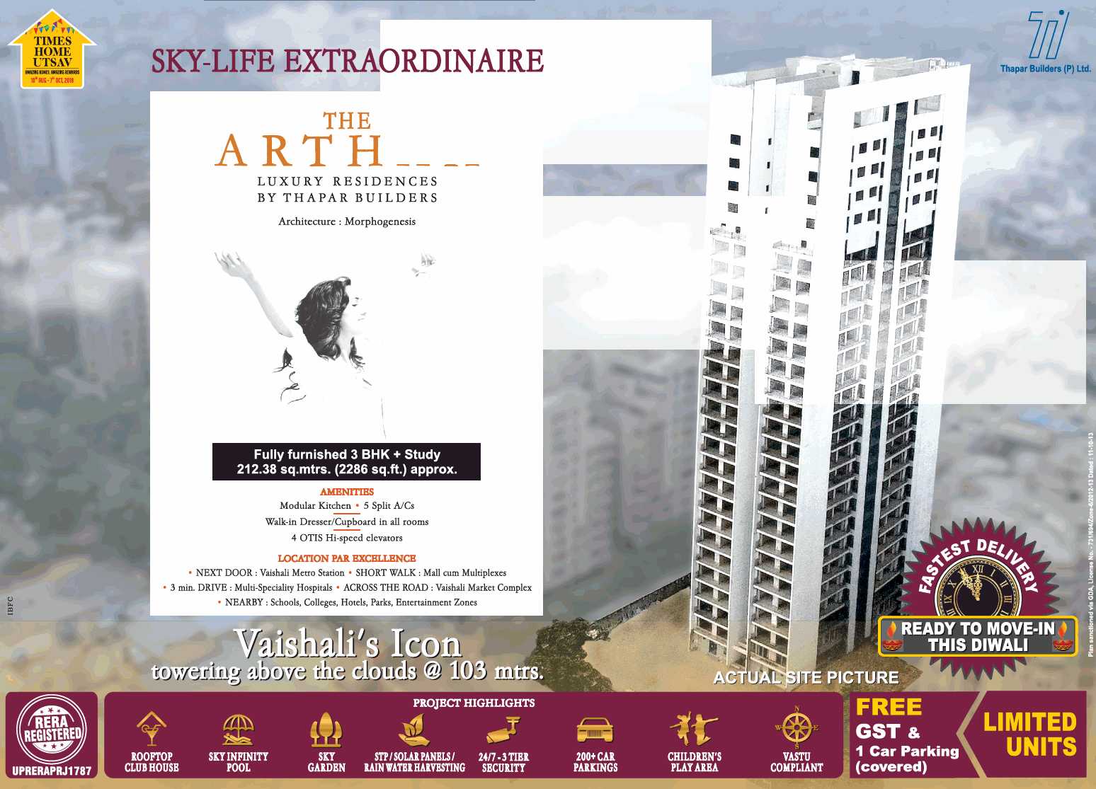 Thapar The Arthah is a residential project developed by the Thapar Builders Pvt Ltd. The project is located at Vaishali Sector 4, NH 24, Ghaziabad. The project offers fully furnished 3 BHK+ study ap