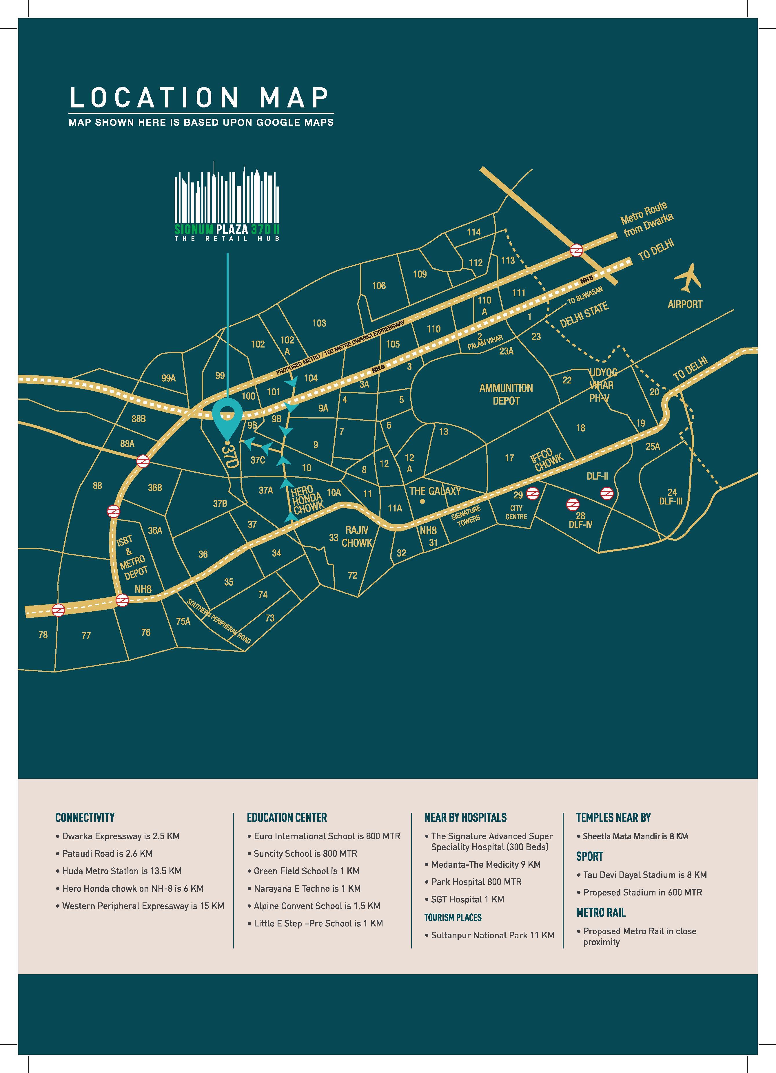 Strategically the location is blessed with a vast number of connectivity combinations, Close proximity to Dwarka Expressway, Signum Plaza 37D (II) is located bang on 60 mtr wide road giving ample space for easy accessibility and well-connected to Hero Honda Chowk, NH-8, Pataudi Road.