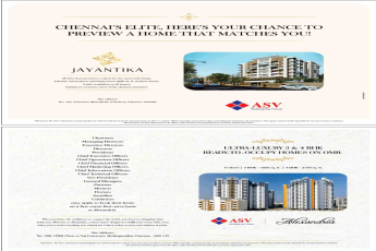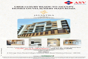 As Chennai is poised for its next phase of growth, ASV offers you a superb opportunity to own a home in one of its promising residential properties with a built-up area of 75000 sq. ft. Located in the prime location of Velachery, the value of the project will grow exponentially by the time of possession. Residents wi...