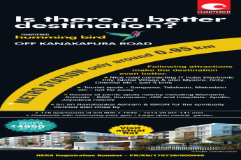 Chartered Hummingbird is a residential project developed by the Chartered Housing (P) Ltd. The project is located at Talaghattapura, Kanakapura Road, Bangalore. The project offers 118 apartments of 2 & 3 BHK size ranging from 1042-1513 sq. ft. at Rs. 4950 per sq. ft.