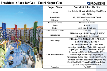 Welcome to Provident Adora De Goa Your dream vacation home awaits amidst the serene beauty of Dabolim, Central Goa. Provident Adora De Goa brings you meticulously crafted homes that promise an enhanced lifestyle. Embrace the exquisite blend of elegance and comfort. Unique Selling Proposition