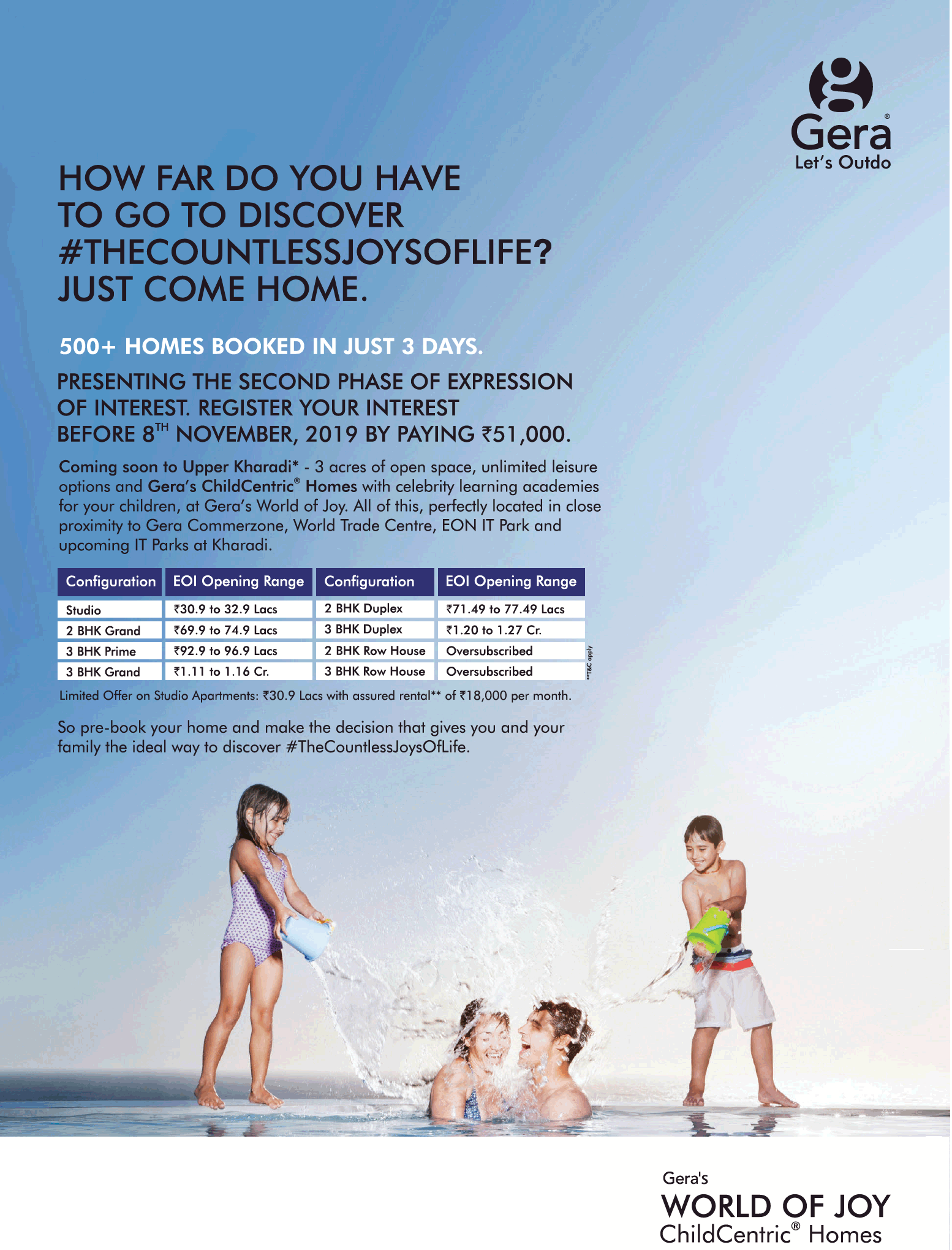 Coming soon to Upper Kharadi* - 3 acres of open space, unlimited leisure options and Gera's ChildCentric® Homes with celebrity learning academies for your children, at Gera's World of Joy. All of this, perfectly located in close proximity to Gera Commerzone, World Trade Centre, EON IT Park and upcoming IT Parks at Kharadi.