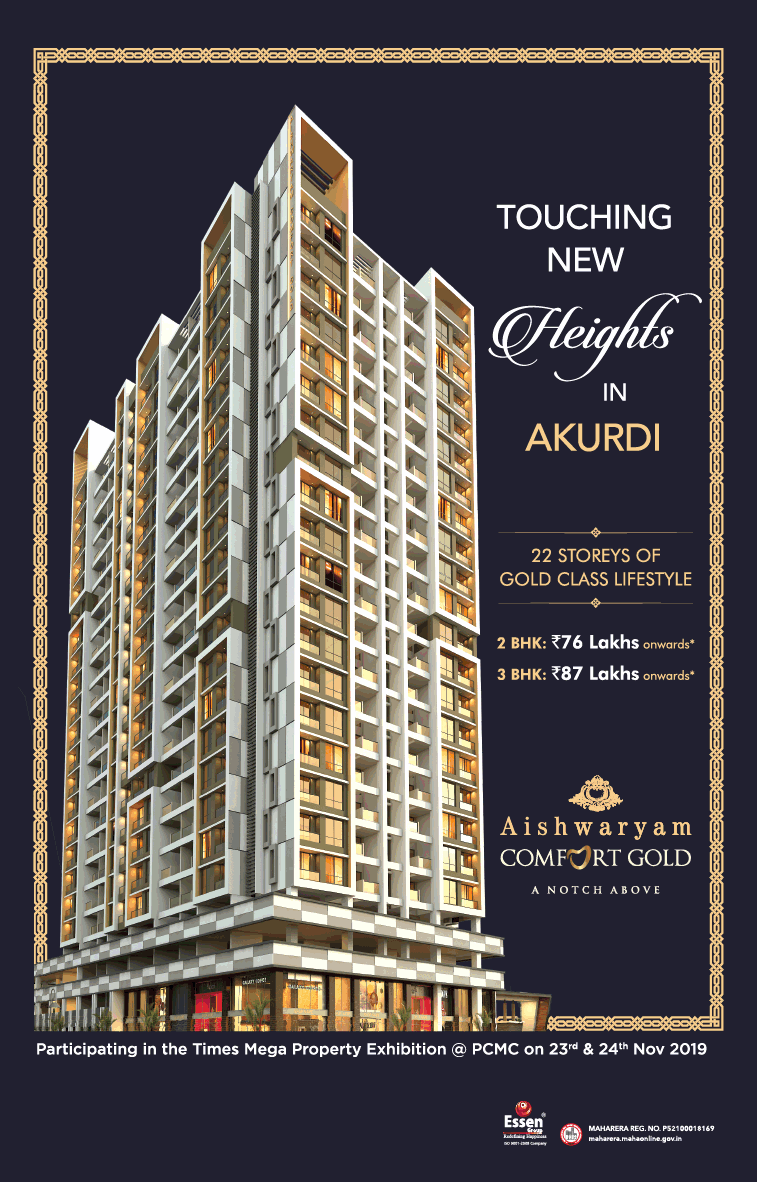 Aishwaryam Comfort Gold is 22 stories of towering elegance. Envisioned as the tallest residential towers in Akurdi. Set in 1.6 acres of lush environs, it boasts of a signature collection of 2 & 3 BHK Gold Residences that spell class and comfort. Crafted for those who are always at the top of their game, here's a home that befits your stature. A world of magnificence, come begin an exclusive lifestyle that's a notch above the rest.