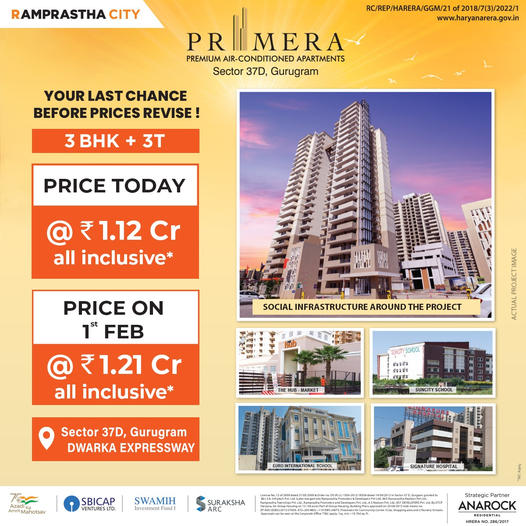 Share Book 3BHK + 3T homes Rs 1.12 Cr all inclusive at Ramprastha Primera, Gurgaon