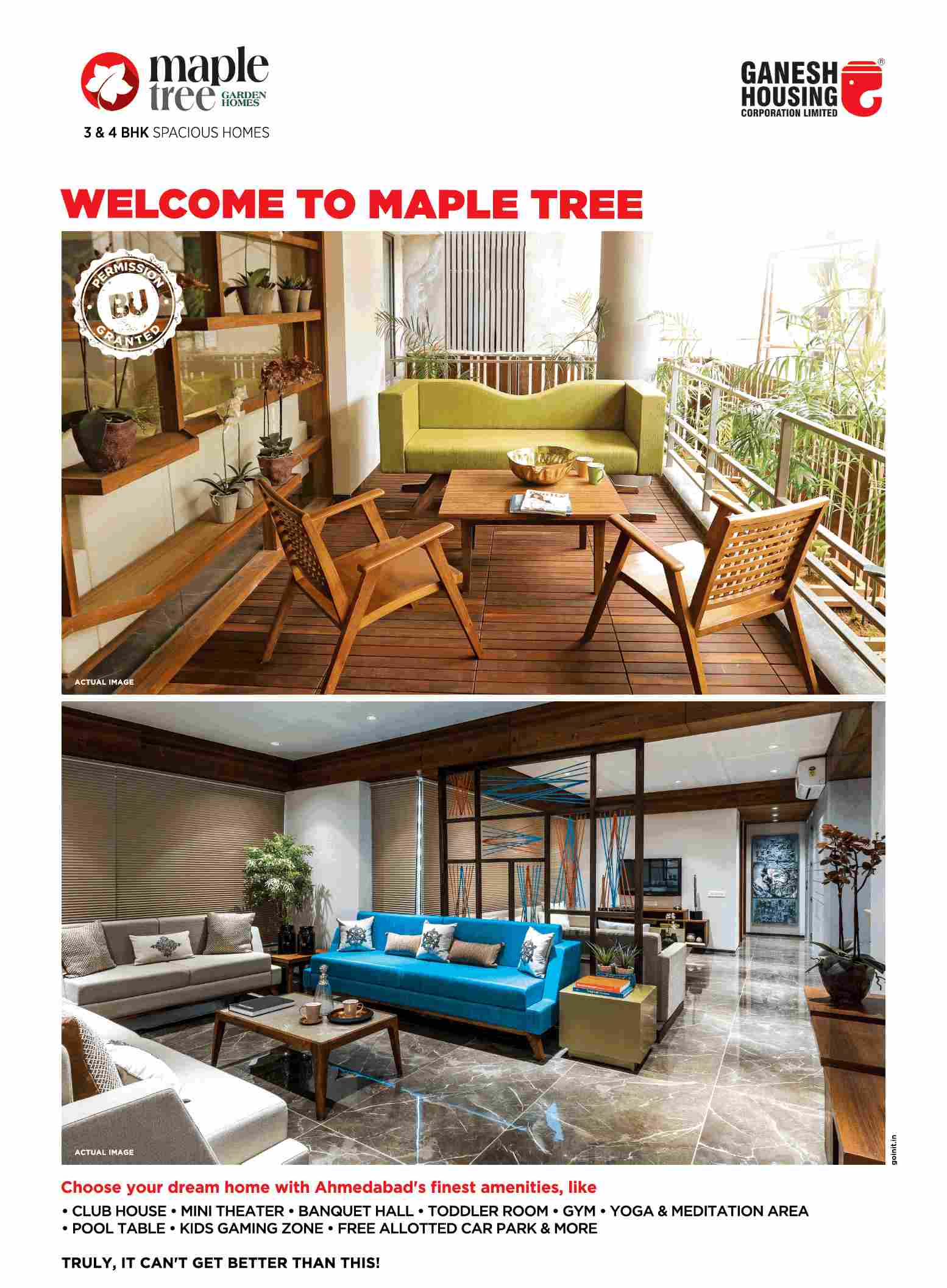 Ganesh Maple Tree is a luxurious residential project developed by Ganesh Housing Corporation Ltd. The project is located in Thaltej, SG Highway, Ahmedabad. The project offers 3 and 4 BHK spacious homes. The project is ready possession with no GST.