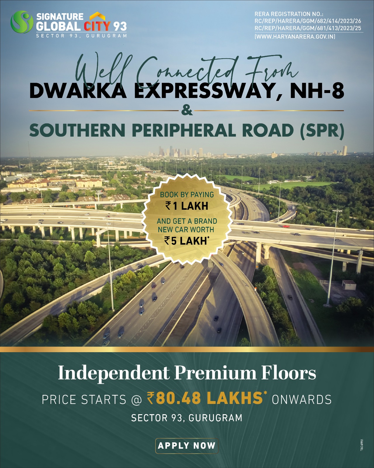 Signature Global City 93, Sector 93, Gurugram offers supreme connectivity to major highways & key areas. 2, 3, 3 BHK+ Study Independent Premium Floors Designed by International Architectural Firm AEDAS Open For Booking. Avail Inaugural offer. Apply by paying Rs. 1 Lakh and getting a brand new car worth Rs. 5 Lakh.