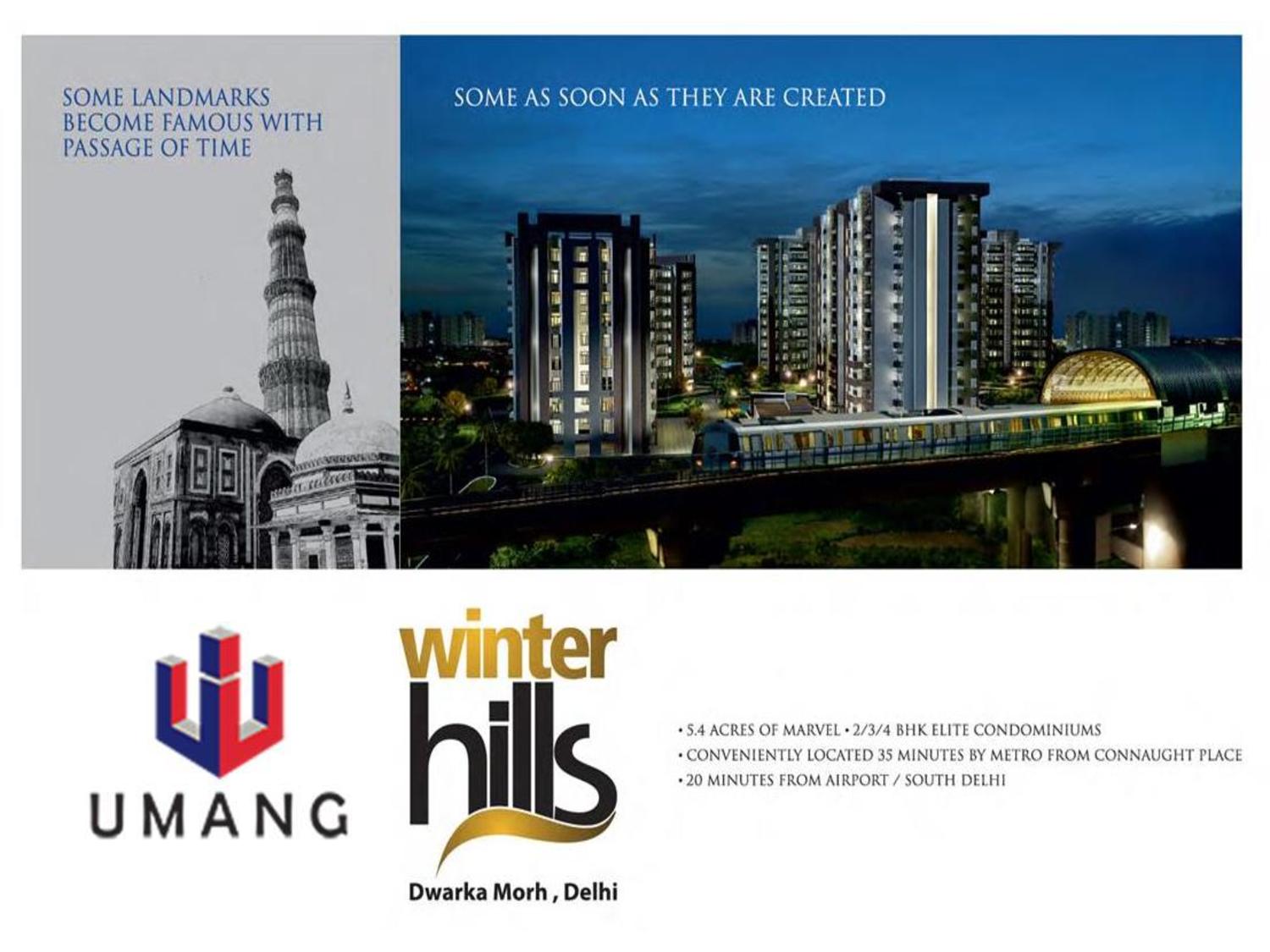 Umang Winter Hills is a luxurious residential project developed by the Umang Realtech (P) Ltd. The project is located in Dwarka Mor, Dwarka Road, New Delhi. The project offers 2, 3 and 4 BHK elite condominiums. The size of the apartments ranges from 1,153 to 2,047 sq.ft.