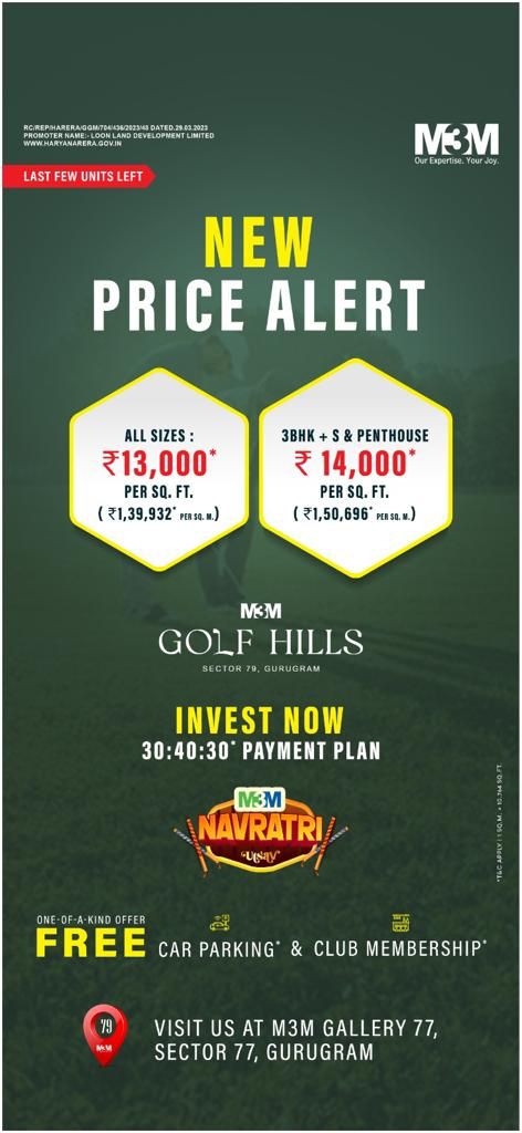 Get ready to embrace an enticing offer from one of Gurugram's most prestigious real estate brands! M3M has just announced a "New Price Alert" for their exquisite properties at Golf Hills, Sector 77, Gurugram. For those who've been eyeing a slice of luxury, now might be the perfect time to invest.